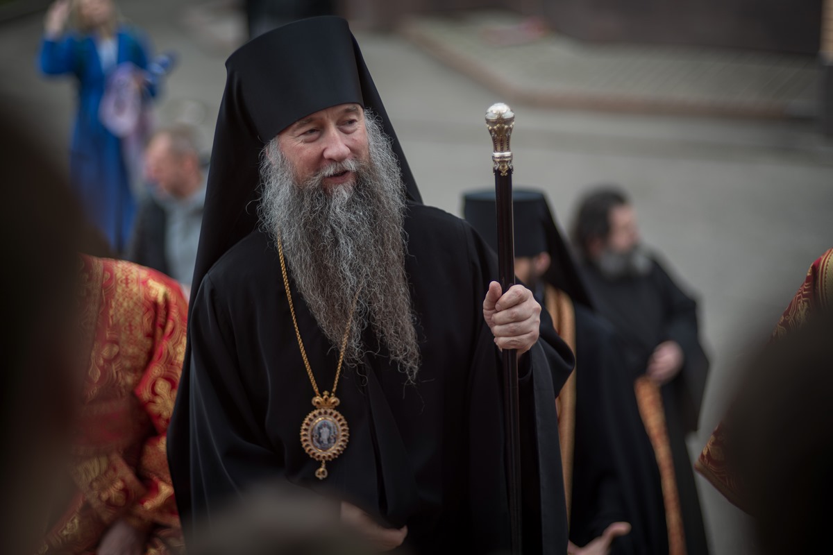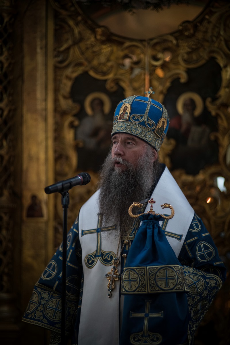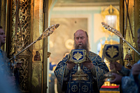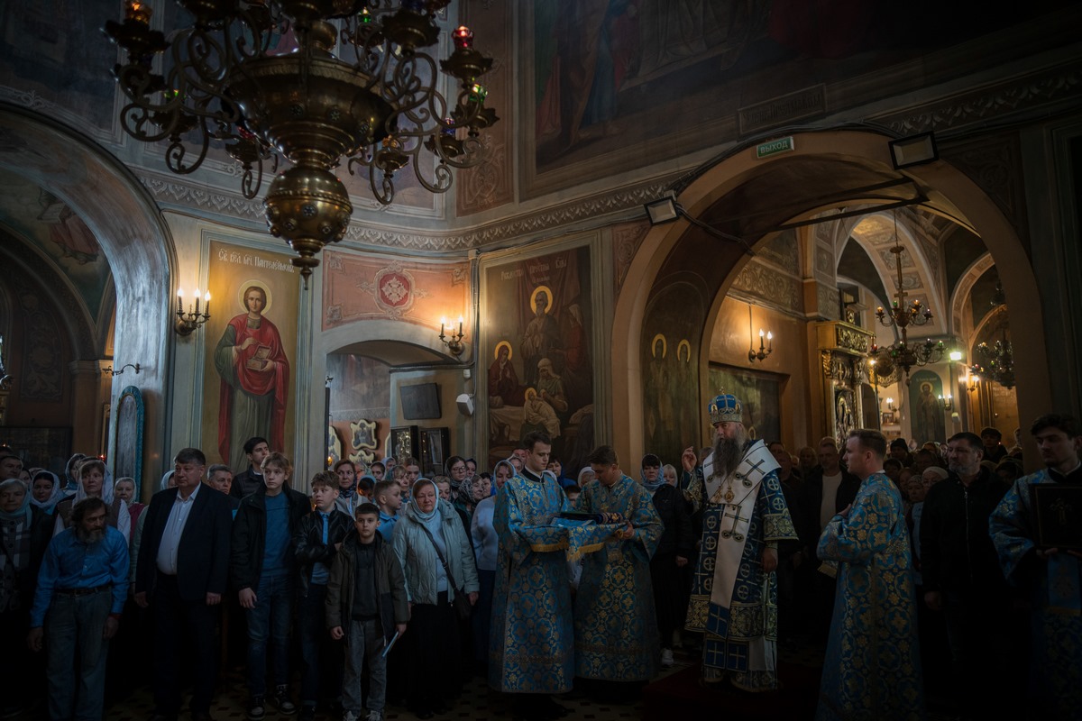 В завершение богослужения настоятель Успенского храма иерей Владимир Дудырев приветствовал епископа Кирилла и преподнёс ему от прихода памятный подарок – панагию с изображением Воскресения Христова. Затем владыка обратился к молящимся с архипастырским словом.