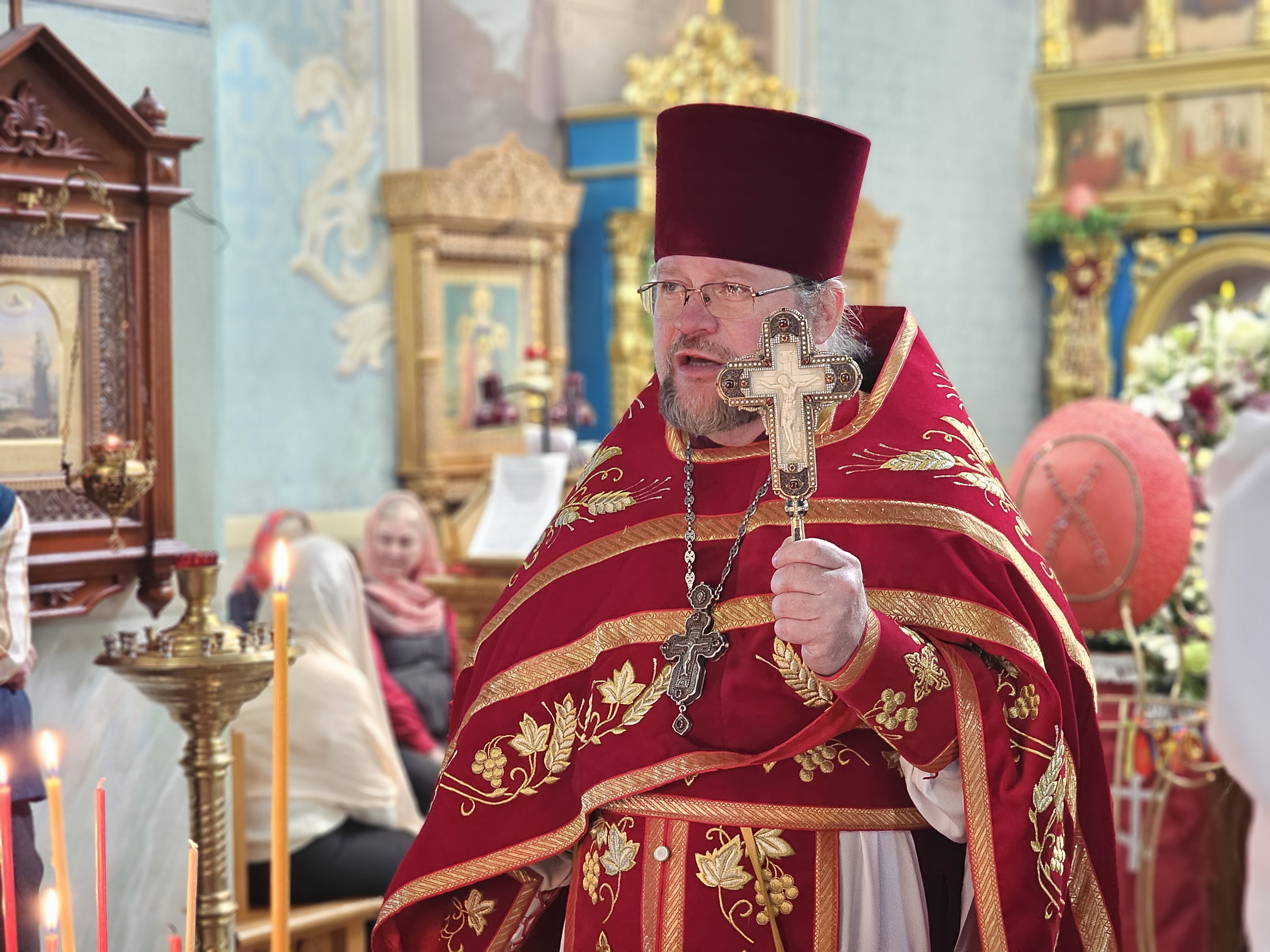 Проповедь по запричастном стихе произнёс настоятель Спасского храма п. Андреевка и Георгиевского храма п. Голубое иерей Димитрий Полещук.