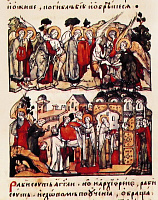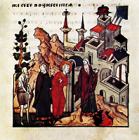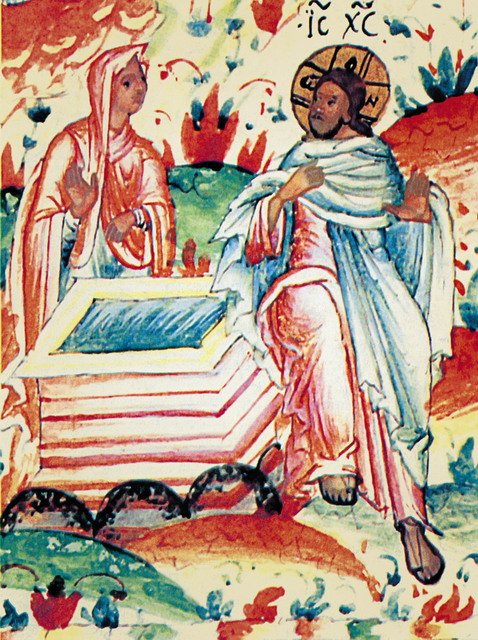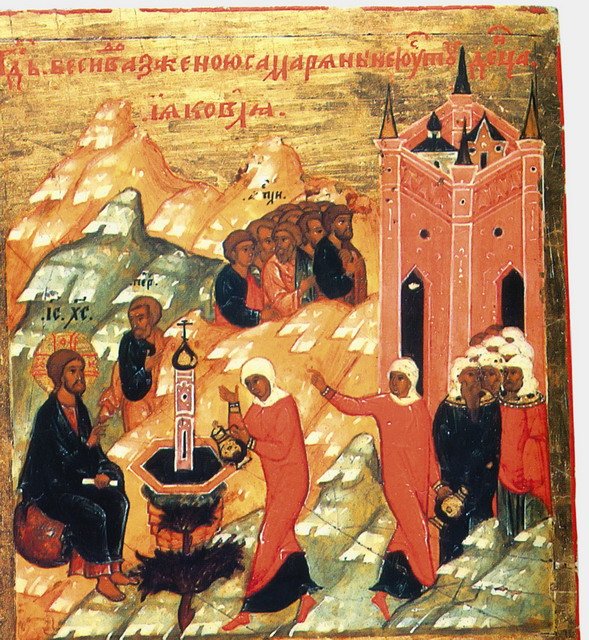 Если Адам был «женскими глаголами прельщен», то Священное Писание дает нам образ и того, как усердствующие в покаянии жены не только сподоблялись личного спасения, но и других к покаянию обращали. Пример тому — самармярянка, беседовавшая у колодца Иаковля со Спасителем: И многие Самаряне из города того уверовали в Него по слову женщины, свидетельствовавшей, что Он сказал ей все, что она сделала (Ин. 4:39). Изображения этой встрече нередки — их можно найти и в книжной миниатюре, и в иконописи, и в храмовой росписи. Если на миниатюре учительного Евангелия изображено самое начало беседы Господа с самарянкой, то на суздальской иконе конца XVI в. композиция включает еще и апостолов, и соплеменников самарянки: И многие Самаряне из города того уверовали в Него по слову женщины, свидетельствовавшей, что Он сказал ей все, что она сделала. И потому, когда пришли к Нему Самаряне, то просили Его побыть у них; и Он пробыл там два дня. И еще большее число уверовали по Его слову (Ин. 4:39–41).