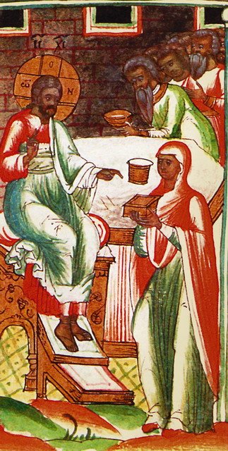 Еще один пример покаявшейся грешницы — на миниатюрах Евангелия апракос. Это покаяние принесло плоды — как сказал о ней Сам Господь: она доброе дело сделала для Меня: ибо нищих всегда имеете с собою, а Меня не всегда имеете; возлив миро сие на тело Мое, она приготовила Меня к погребению; истинно говорю вам: где ни будет проповедано Евангелие сие в целом мире, сказано будет в память ее и о том, что она сделала (Мф. 26:10–13).
