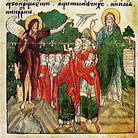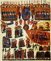 В центре самого верхнего регистра композиции располагается Бог Саваоф; рядом с Ним — ангелы, свертывающие свиток небес: И небо скрылось, свившись как свиток (Откр. 6:14). Другая группа ангелов низвергает в преисподнюю демонское полчище. Одесную Отца Небесного изображен Горний Иерусалим. В средней части композиции помещены «праведных души в руце Божией», весы — «мера дел человеческих». Нижняя часть отведена аду со всеми его обычными иконографическими атрибутами: здесь можно видеть и четырех зверей, символизирующих «царства погибельные», и находящегося на границе ада «милостивого блудника». Из недр адских, от зверя, на котором сидит сам сатана, поднимается вверх композиции к ногам Адама извивающийся змей — олицетворение греха… «Страшное судище Твое помышляя, Преблагий Господи, и День судный, ужасаюся и боюся, от совести моей обличаемь» (икос). Миниатюра Евангелия