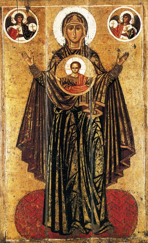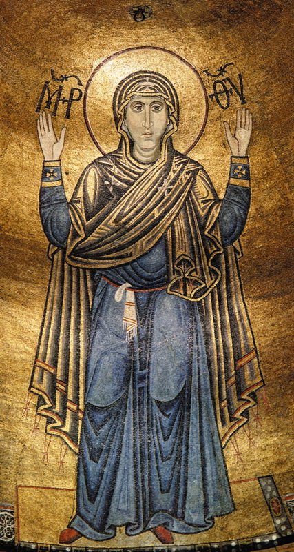 Самыми ранними из дошедших до нас изображений Богоматери в храмовой росписи являются мозаики собора Киевского Софийского собора. Об основании этого величественного храма сообщает Ипатьевская летопись под 1037 г.: «Заложи Ярослав город великий Киев… заложи же и церковь Святыя София, Премудрость Божию митрополью». Другая летопись, Густынская, говорит о том, что «церковь прекрасная Св. Софии» украшена была «всякою красотою, златом и каменеем многоценным, иконами и кресты…» [цит. по: Этингоф, с. 71–72]. Мозаики Софии Киевской были созданы в