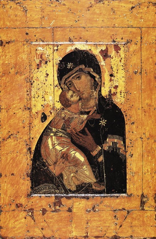 Одной из самых известных и, несомненно, самой почитаемой в центральной Руси была икона Богоматери, именуемая Владимирской, привезенная на Русь в первой трети XIII в. Судьба ее складывалась драматично. В 1155 г. князь Андрей Боголюбский перенес ее из Вышгорода во Владимир, украсил дорогим окладом и поместил в Успенский собор, построенный в середине XII в. После убийства князя Андрея Боголюбского в 1176 г. князь Ярополк снял дорогой убор с иконы, и она оказалась у князя Глеба Рязанского. Лишь после победы князя Михаила, младшего брата Андрея Боголюбского, над Ярополком Глеб вернул икону и оклад во Владимир. При взятии Владимира татарами, во время пожара Успенского собора в 1237 г. собор был разграблен, и с иконы Богоматери вновь содрали оклад. В 1395 г., во время нашествия Тамерлана, икона была привезена в Москву, и в тот же день (26 августа) Тамерлан отступил от Москвы и покинул пределы русского государства. Позднее икона пребывала в иконостасе главного храма страны — Успенского собора Московского Кремля. В 1812 г. перед древней святыней, увезенной в Муром, молились об избавлении от нашествия двудесяти языков. В 1918 г. икону из Успенского собора забрали; сейчас она в Третьяковской галерее. В 1993 г. перед Владимирской иконой возносил горячие молитвы святейший Патриарх Алексий II — стране грозила опасность быть ввергнутой в пучину новой гражданской войны.
