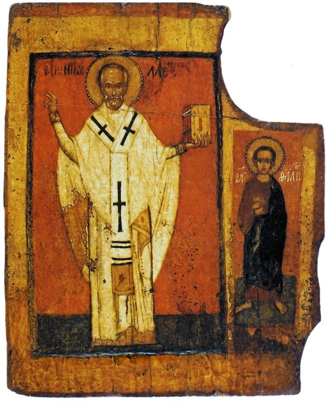 Наконец, надо назвать святыню из города Можайска — ростовую деревянную скульптуру Николы Можайского XIV в. (может быт начала XV в.). Статуя стояла на крепостных воротах города под открытым небом. Она дала начало новому иконографическому типу изображения Николая Чудотворца — с раскинутыми руками, в одной из которых святитель держит меч, а в другой — модель града.