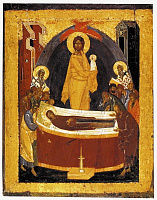 Исключительно гармонична икона из Коломны «Воскресение Христово — Сошествие во ад». Тема Воскресения, Возрождения всей Русской земли и каждого ее обитателя в широком смысле этого слова также была исключительно важна. Уже современники чувствовали совершенно необычное воодушевление, духовное движение, соединенное с политическими переменами. О княжении святого благоверного князя Димитрия Донского говорили так: «и вскипе земля Русская в дни княжения его». Воскресение Христово — центр нашей веры, что так точно выражено в пирамидальной композиции иконы, где все и всё устремляется ко Христу. Первыми освобождаются от уз ада прародители Адама и Евы, затем праотцы, пророки, праведники. Это воскресение возможно благодаря внутреннему очищению, стяжанию святости, добродетелям. Мастер иконы поместил в мандорле (сиянии вокруг фигуры Христа) белые сферы, где были подписаны эти добродетели: любовь, мир, долготерпение и другие.