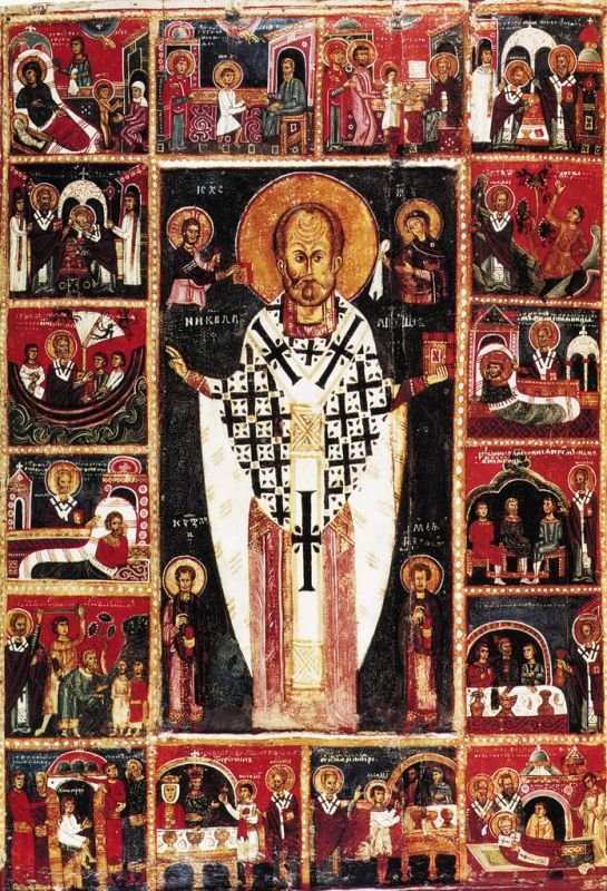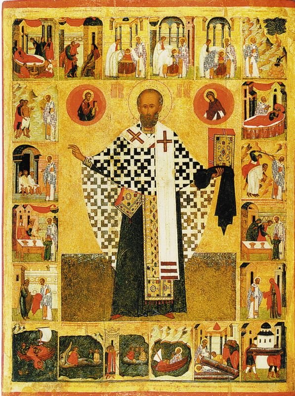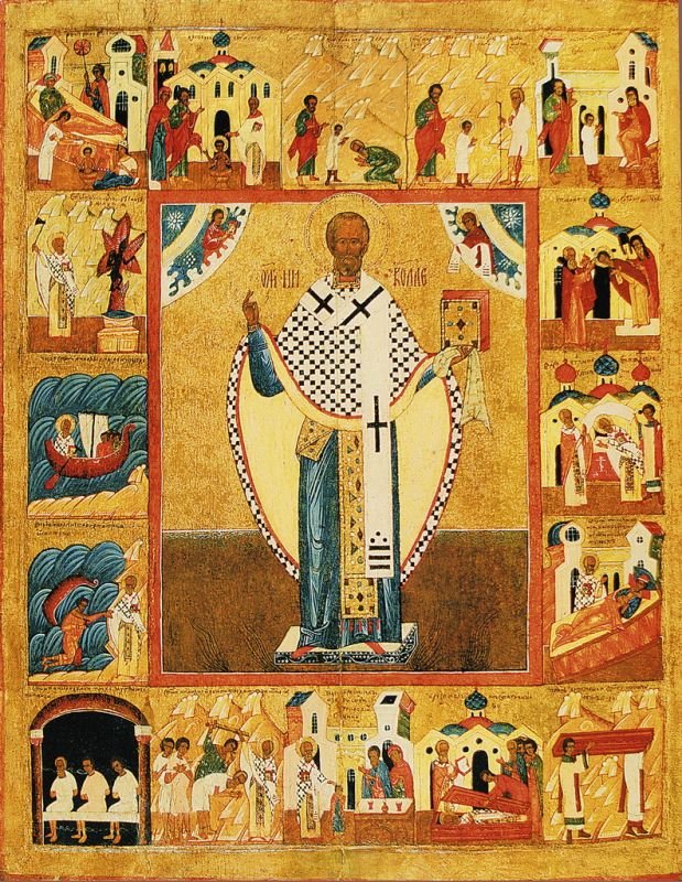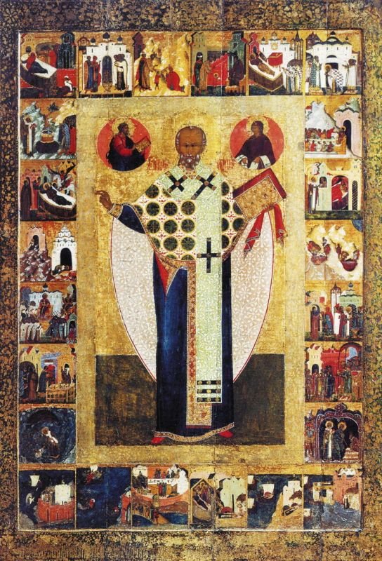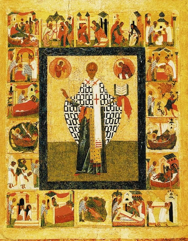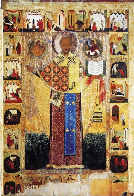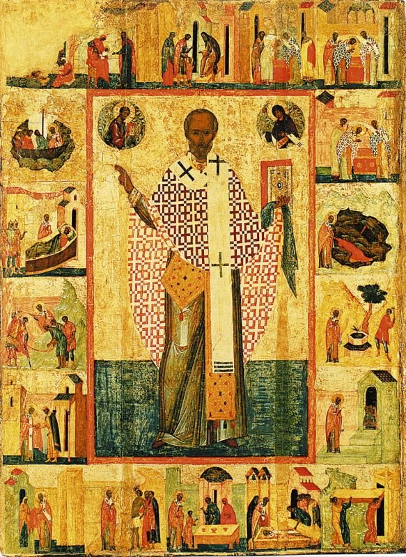 К домонгольскому времени относится и появление поясных икон святителя с житийными клеймами; в качестве примера можно назвать икону святителя Николая с восемнадцатью клеймами второй половины XIV в. псковского письма, происходящую из