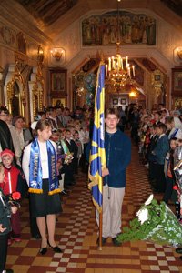Но время не стоит на месте. Пролетела еще одна неделя ? и учебный год в воскресной школе объявил о своем наступлении уже официально. В люберецком Свято-Троицком храме по окончании поздней Божественной литургии состоялась торжественная линейка. Построение по классам ? и пение школьного гимна. Впервые гимн был исполнен хором преподавателей. Под звуки главного школьного песнопения Петр Радченко передал флаг новому знаменосцу ? Ирине Алейниковой, которая и установила стяг на постамент. В этот день у школы был еще один праздник. 1 сентября 1996 года ее директор был рукоположен в священники. И вот ученики поздравляют о. Олега Матвейченко с 10-летием его священнического служения. Представители от каждого класса (а классов уже 9) вручают директору цветы, а знаменосец ? подарок от всей школы: многокилограммового бронзового слона.