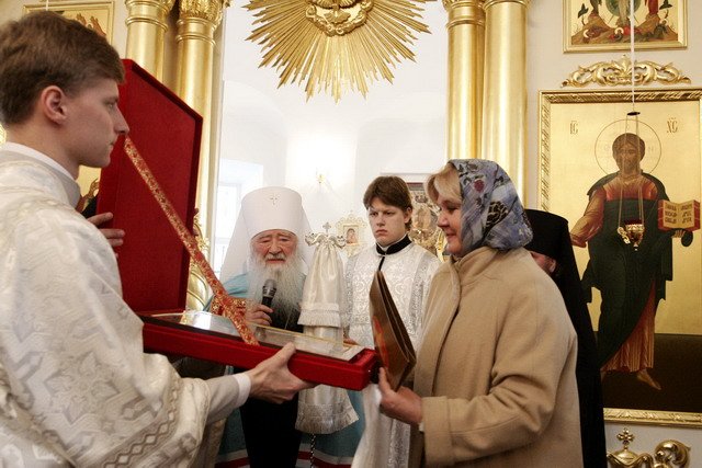По этому поводу специально заказывали икону святого Архистратига Божия Михаила. И нам хочется попросить Вас принять это образ для передачи его Борису Всеволодовичу с горячими пожеланиями, чтобы Архистратиг Божий был и его личным заступником, помогая преодолевать любые проблемы и скорби, которые встречаются на пути жителей Подмосковья, по управлению этой огромной областью, где восстанавливается духовная и церковная жизнь. К этому дню мы выпустили Грамоту, где изображена соборная площадь Коломны, а внутри — храм Михаила Архангела. И эту первую грамоту, которую получат все священнослужители и высокие гости, я прошу Вас, Галина Константиновна, передать Борису Всеволодовичу Громову. Я также с благодарностью от всех нас прошу Вас принять памятную Грамоту.