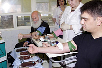 Безвозмездно сдать свою кровь для больных детей пришло вместе с благочинным протоиереем Константином Островским более 30 человек, но не всем позволило состояние здоровья, кровь можно было взять только у 19 из пришедших доноров.