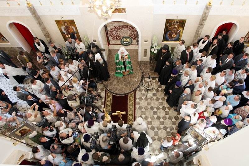 С Первосвятительским словом к собравшимся обратился Святейший Патриарх Московский и всея Руси Кирилл. В дар храму Святейший Владыка передал набор евхаристических сосудов и Казанский образ Божией Матери.