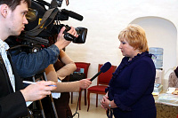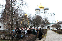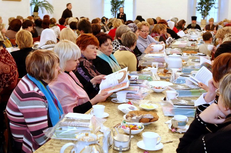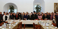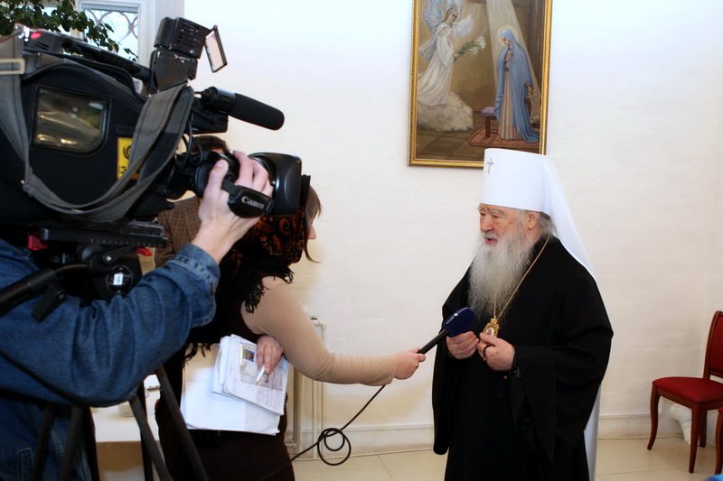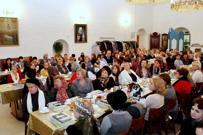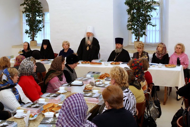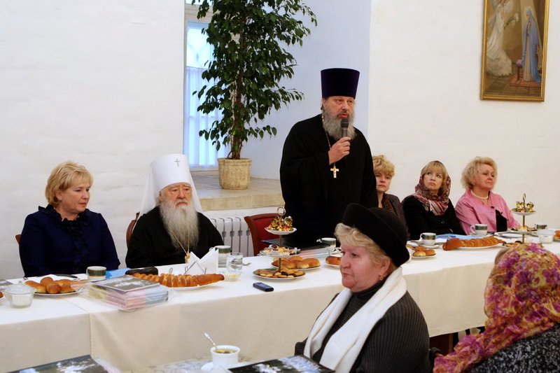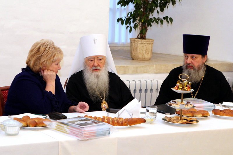 Я рад вас приветствовать в нашем Новодевичьем монастыре. В этом году вся обитель нашим правительством была передана Московской епархии, и мы сегодня радуемся этому обстоятельству, и, конечно, озабочены ее сохранением, потому что это требует не только наших молитв, но и огромных средств для поддержания этого древнего памятника. Я очень хотел бы, чтобы вы пожертвовали своим временем и после нашей встречи немного ознакомились с нашими выставками, с историей монастыря, поняли его историческое значение для Церкви и России. Здесь все переплеталось, и слава Богу, что этот монастырь один из немногих в Москве, который в таком прекрасном состоянии дошел до нас. Мы вчера проводили первое заседание созданного нами благотворительного фонда по восстановлению нашей обители. Мы оптимистично смотрим в будущее, не дрогнули, что на наши плечи легли эти обязанности, видим вокруг себя много доброжелательно настроенных людей, которые готовы и словом и делом нам помогать. Вы находитесь сейчас в древней трапезной: мы восстановили обычай, что здесь питаются и монахини, но у нас несколько учреждений на территории монастыря: Московское епархиальное управление, откуда мы управляем всей церковной Московской областью, здесь мы открыли церковный музей, куда пригласили ученых, сотрудников других музеев, которые имеют большой опыт работы. И через наш монастырь проходят буквально тысячи туристов и паломников, и мы продолжаем, как это делалось раньше, встречать всех, рассказывая о жизни монастыря и его истории. И сегодня вы наши возлюбленные и дорогие гости. Хотелось бы, чтобы вы не почувствовали себя чужими среди нас, а были как наши братья и сестры. Сейчас вам предложат чай, мы будем дальше продолжать беседу, а потом я вас приглашаю походить по монастырю. В моей резиденции есть надвратная церковь, там богослужения редко совершаются, это моя крестовая церковь, моя молельня. Это древняя церковь с прекрасно сохранившимся иконостасом, хотел бы, чтобы вы и ее посетили. Так что чувствуйте себя как дома и добро пожаловать! И с особым чувством я бы хотел передать этот микрофон Лидии Николаевне».