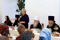 Настоятельница обители игумения Маргарита сказала: «Ваше Высокопреосвященство, дорогой Владыка, уважаемая и дорогая Лидия Николаевна, дорогие наши гости. Мы очень рады видеть вас сегодня в нашей обители. Владыка митрополит сказал, что сегодняшняя встреча лишь одна из тех, которые проходили в нашей обители. Это очень радует, тем более, что сегодняшняя встреча проходит накануне празднования