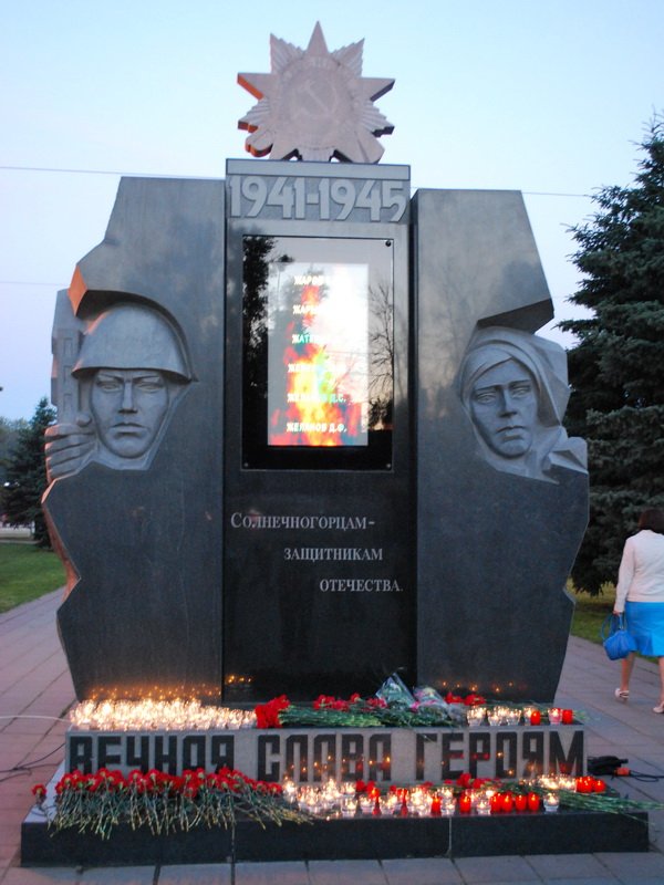 22 июня в 4 часа утра в Солнечногорске прошла акция «Свеча памяти», посвященная 71-й годовщине начала Великой Отечественной войны. К мемориалу «Солнечногорцам — защитникам Отечества» на Советскую площадь города пришли представители администрации, советов депутатов района, городских и сельских поселений, совета ветеранов, Солнечногорского отделения «Единой России», жители района, школьники. Со словами благодарности воинам, защитившим нашу Родину от фашизма, выступили заместитель главы администрации Солнечногорского района М. Панфилова, председатель районного совета ветеранов Н. Сотниченко, ветеран Вооруженных сил В. Кривулин, представительница молодежи Е. Ворона. Литию по павшим героям совершил ответственный по связям с Вооруженными силами и правоохранительными учреждениями в Солнечногорском благочинии священник Александр Азаров.