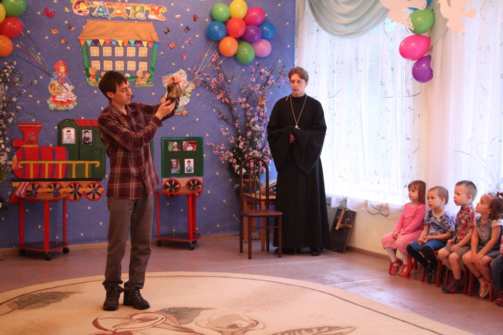 24 мая в детском саду № 22 «Родничок» состоялся утренник, посвященный празднику Пасхи. В гости к ребятам пришел клирик храма Преображения Господня священник Иоанн Слобжин вместе с приходским звонарем Сергеем Агахановым. Отец. Иоанн рассказал детям о празднике Пасхи и поведал о традициях, связанных с ним. Когда речь зашла о колокольном звоне, слово взял звонарь Сергей. От него ребята узнали об устройстве колоколов, их месте и значении в жизни Церкви. В завершение каждый из детей смог позвонить в принесенные из храма малый колокол и било.