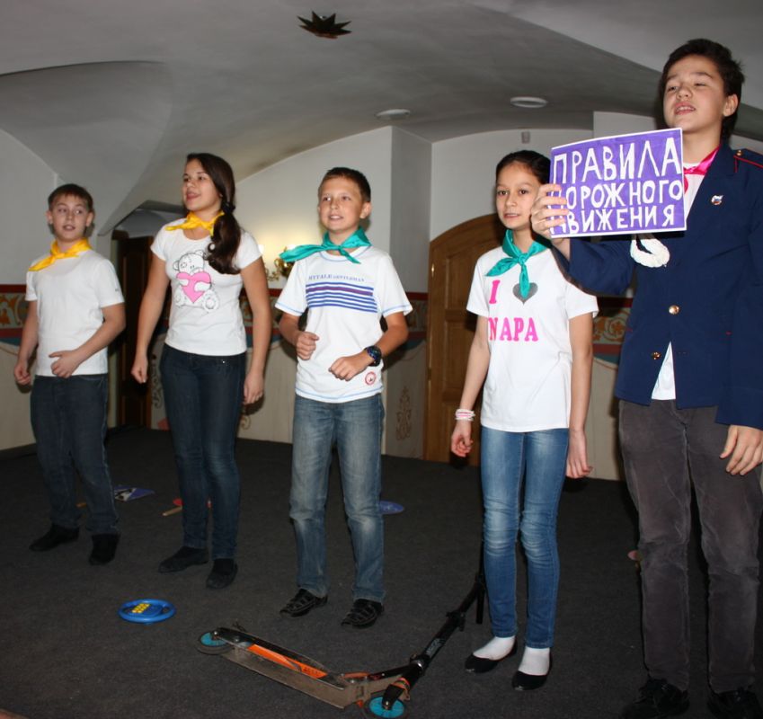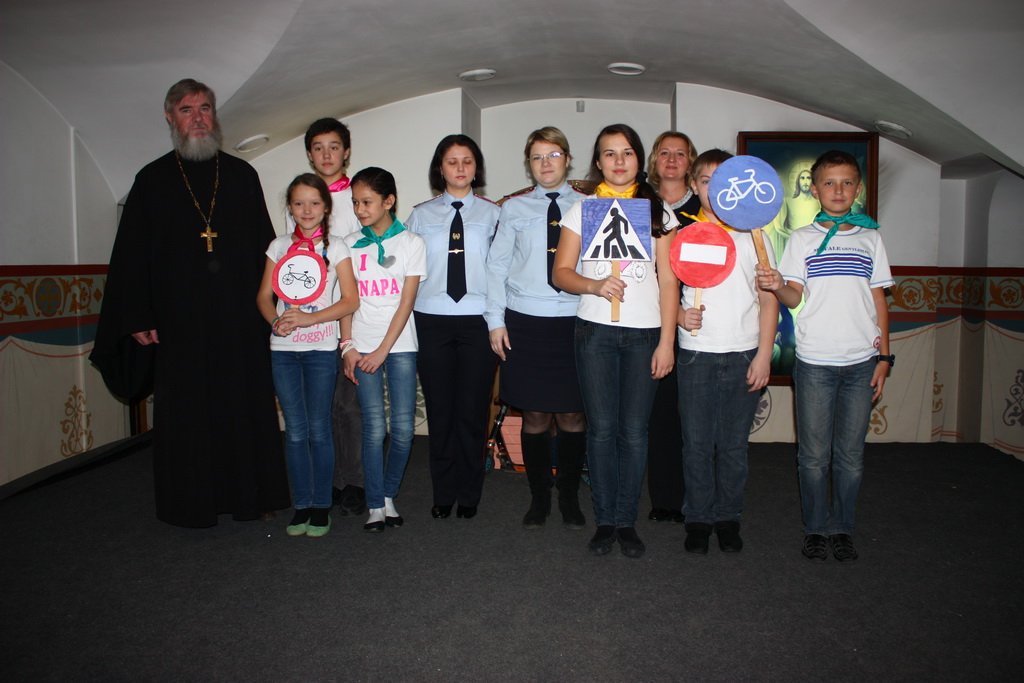Затем все были приглашены в цокольный этаж храма на назидательное представление, предваряемое выступлением представителя ГИБДД. В представлении приняли участие ученики люберецких школ. Звучали песни и демонстрировались сценические миниатюры, призывающие к вниманию на дорогах и повествующие об истории автомобиля, светофора и правил дорожного движения.