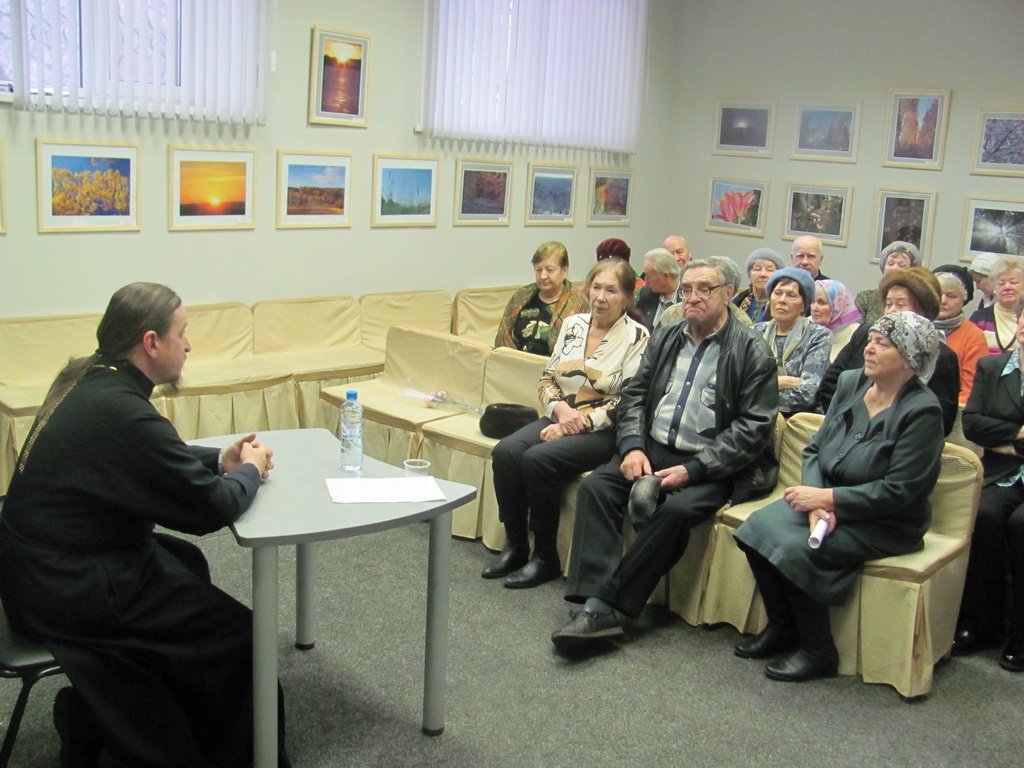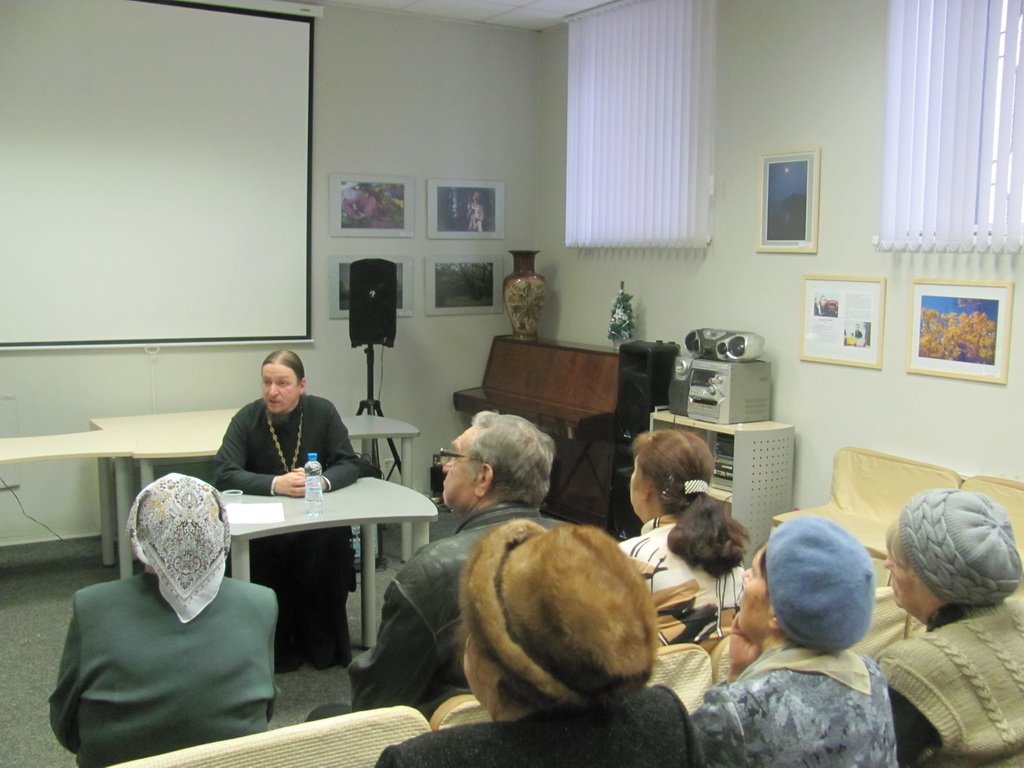 20 декабря состоялась уже традиционная встреча ветеранов г. Лобня с клириком Филаретовской церкви священником Евгением Ткаченко. В начале декабря празднуется память святых, связаных с лобненскими храмами, поэтому беседа была посвящена рассказу о них. Отец Евгений рассказал о святителе Филарете Московском, священномученике Серафиме Чичагове, священномученике Иоанне Виноградове. Затем батюшка ответил на вопросы присутствовавших.