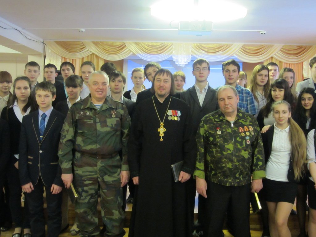 На встречу были приглашены настоятель Крестовоздвиженского храма села Дарна протоиерей Константин Волков, который сам прошел дорогами афганской войны, и его однополчане. Активное участие в проведении этой встречи приняли учащиеся