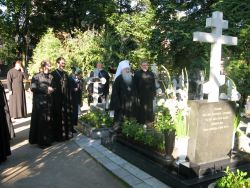 По окончании панихиды все участники богослужения Крестным ходом прошли на Никольское кладбище монастыря, где у могилы почившего архипастыря митрополит Ювеналий возложил венок и отслужил заупокойную литию. По традиции многих лет в окончании молитвенного поминовения хор пропел Кондак праздника Успения Пресвятой Богородицы и седален «Апостоли от конец земли».