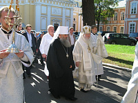 Мы, архипастыри и пастыри, приехавшие сегодня из разных мест нашей земли, благодарны владыке Варсонофию, что он с любовью нас принимает, благословляет помолиться в этом величественном соборе и помянуть нашего духовного отца. И сейчас мы совершим панихиду и посетим кладбище, где покоится блаженно почивший митрополит Никодим, и вознесем свою сердечную молитву о упокоении его души, чтобы Господь вселил его там, где нет уже ни болезни, ни печали, ни воздыханий, но прибывает жизнь бесконечная в Царствии Небесном. Аминь».