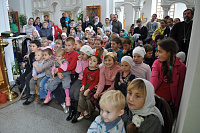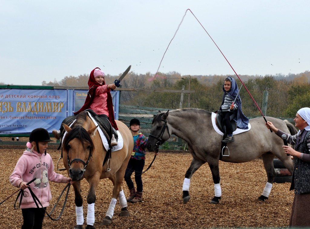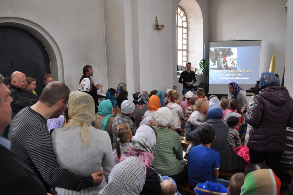 После окончания воскресного богослужения прихожане Иоанно-Богословского храма были приглашены на выступление, подготовленное учениками детского конного клуба «Святой князь Владимир». Прихожанам были показаны фото- и видеоматериалы о важных событиях прихода и воскресной школы за минувший учебный год. Настоятель храма протоиерей Александр Харламов представил детям и родителям руководителя, наставников по отдельным предметам и ремеслам и кураторов клуба. Присутствующим были продемонстрированы образцы форменной одежды, стилизованные под древнерусские плащи, и деревянные мечи.