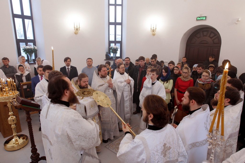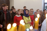14 февраля в г. Солнечногорске прошел I районный форум православной молодежи «Идеология лидерства», организованный администраций Солнечногорского района и Солнечногорским благочинием. Форум начался с Литургии в новопостроенном Знаменском храме деревни Голубое городского поселения Андреевка, которую возглавил ректор Коломенской православной духовной семинарии епископ Зарайский Константин. Владыке Константину сослужили благочинный Солнечногорского округа протоиерей Антоний Тирков, председатель Епархиального отдела по делам молодежи священник Александр Сербский, настоятель храма иеромонах Николай (Летуновский), секретарь Епархиального отдела по делам молодежи священник Григорий Федотов, помощник председателя Епархиального отдела по делам молодежи священник Сергий Себелев и ответственный за пастырскую работу с молодежью в Солнечногорском благочинии священник Василий Лакомкин. За богослужением молились советник главы Солнечногорского района по вопросам культуры и связям с общественными и религиозными организациями