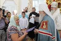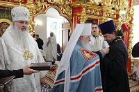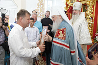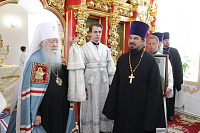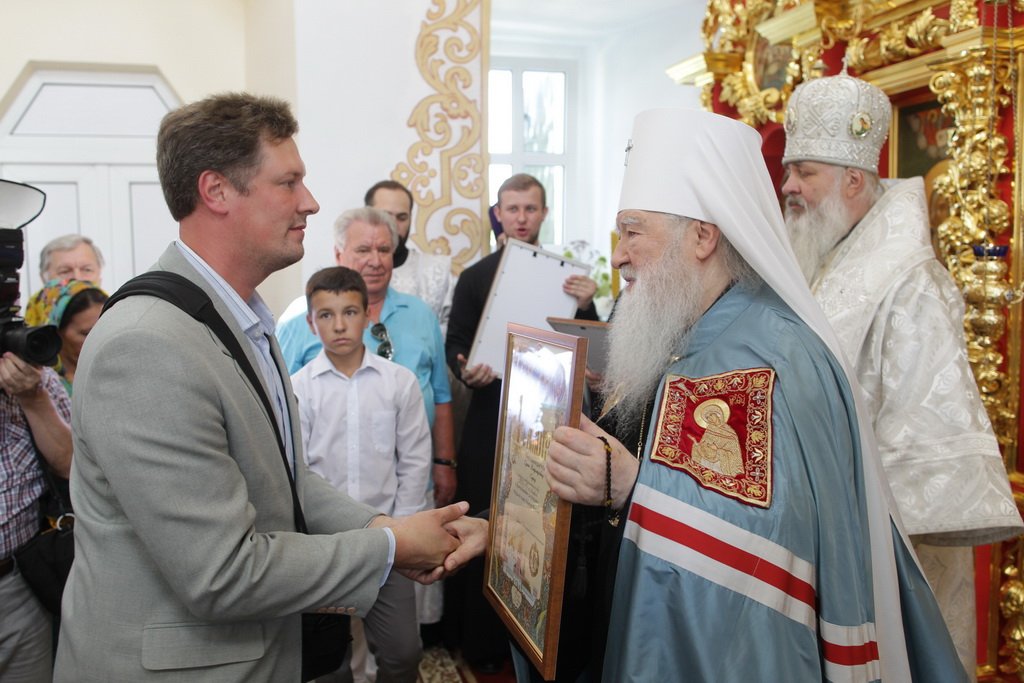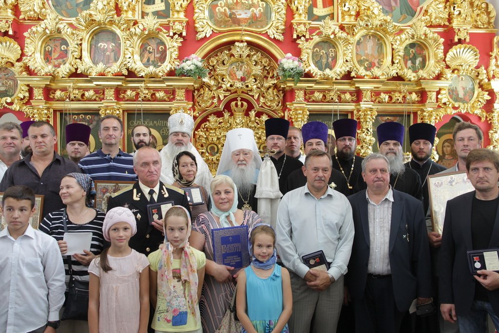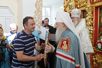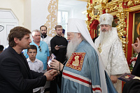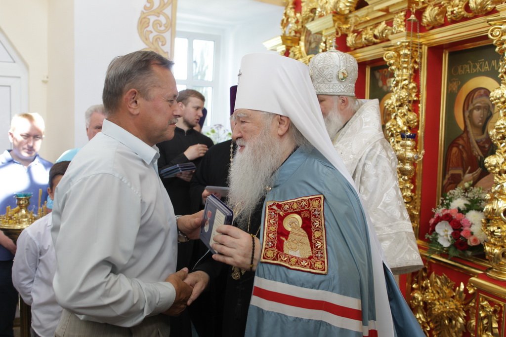 Владыка митрополит вручил церковные награды усердным труженикам и благотворителям Смоленского храма. Настоятель храма протоиерей Владимир Гончаров был удостоен ордена преподобного Сергия Радонежского III степени,