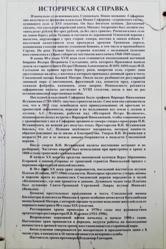 Памятники подмосковного села Сафарино (ныне Софрино Пушкинского района) привлекали внимание исследователей уже в первой половине XIX в. До наших дней сохранились каменная Смоленская церковь с поздними пристройками, липовый парк и пруды. В конце XVII в. село Сафарино с деревнями Кленики и Бурлаково было пожаловано боярину Федору Петровичу Салтыкову. Село в то время располагалось на левой стороне пруда, образованного плотиной на реке Талице. В центре находилась деревянная церковь с погостом.