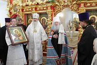 Дорогой отец Владимир, я с благоговением принял ваш дар — икона Смоленской Божией Матери мне особенно близка и дорога, потому что много лет, с 1977 года я совершаю свое служение в Новодевичьем монастыре, который посвящен этой иконе, и через несколько дней будет совершаться престольный праздник у нас и у вас. И я хотел бы пожертвовать эту икону для вашего храма, чтобы она была у вас для поклонения, чтобы вы вспоминали сегодняшний праздничный день и поместили ее на стене, где еще много свободных мест для украшения, и пусть Матерь Божия хранит всех, кто будет с молитвой и верой молиться перед ней, на многая и благая лета. Я хотел бы вам, и тем, кто помогал вам восстанавливать храм, вручить наши церковные награды».