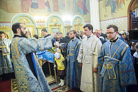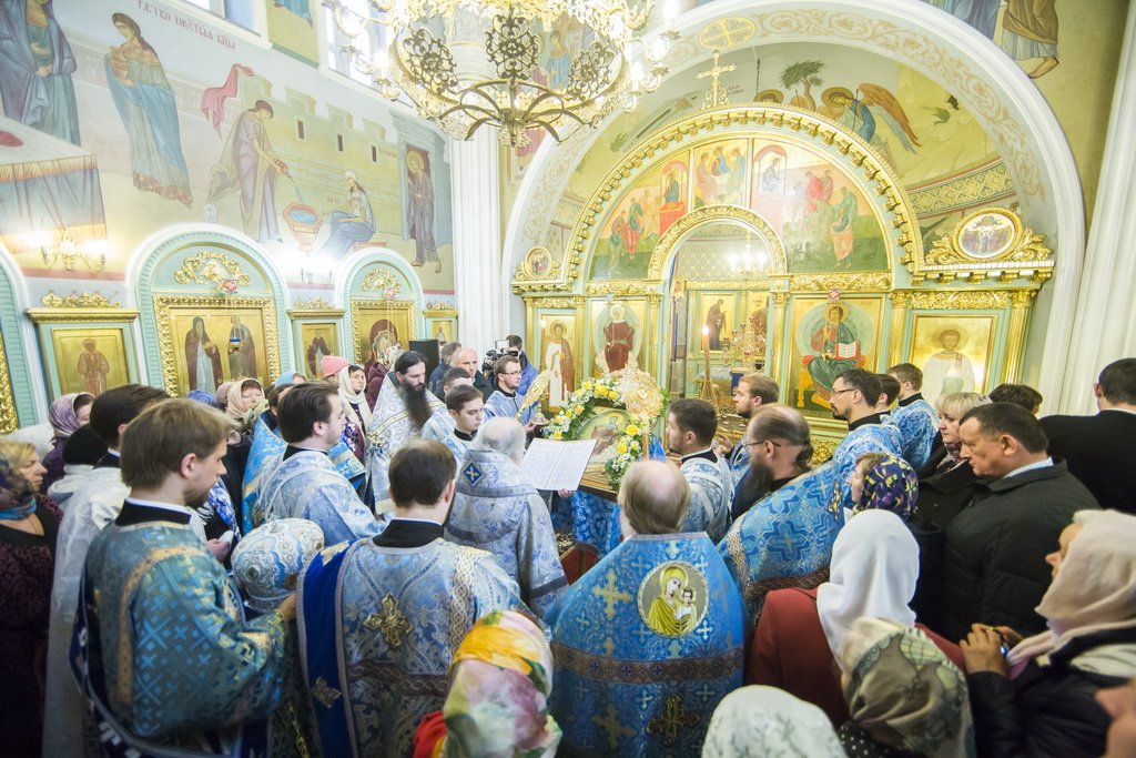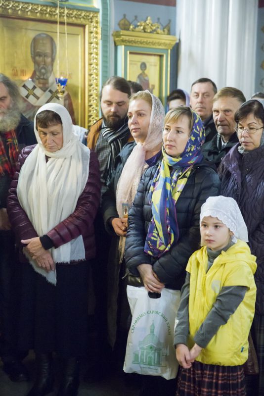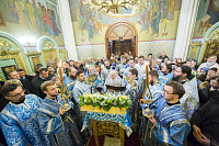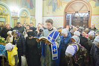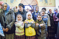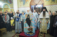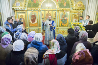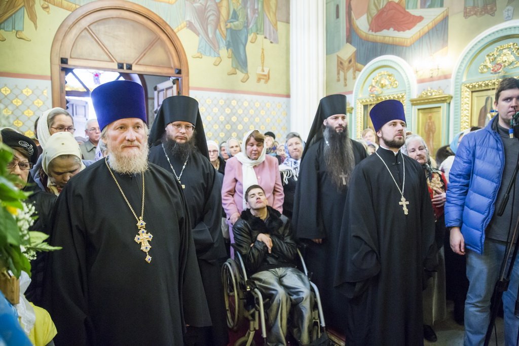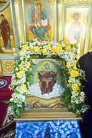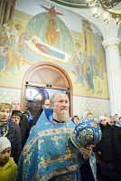 По окончании Литургии Владыка совершил славление перед иконой Божией Матери «Спорительница хлебов», а затем обратился к собравшимся с архипастырским словом: «Всечестные отцы, возлюбленные братья и сестры, сердечно поздравляю вас с престольным праздником этого, хотя и нового, но уже намоленного храма. Причастников и причастниц поздравляю с принятием Святых Христовых Таин.