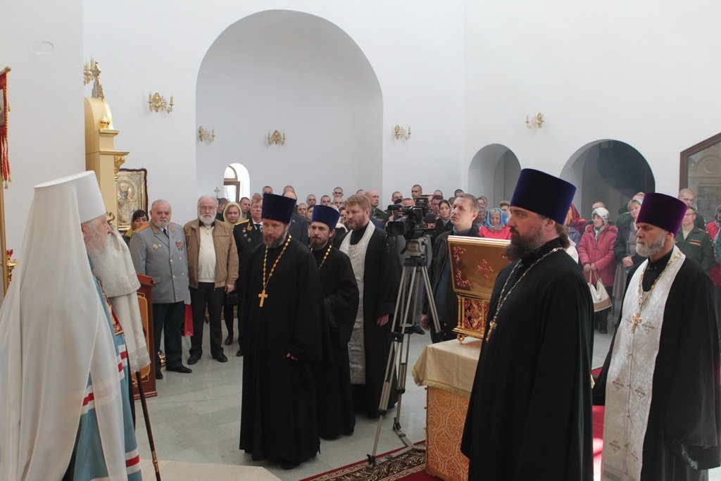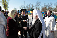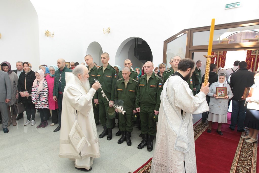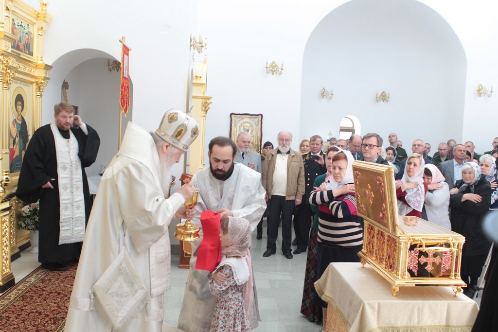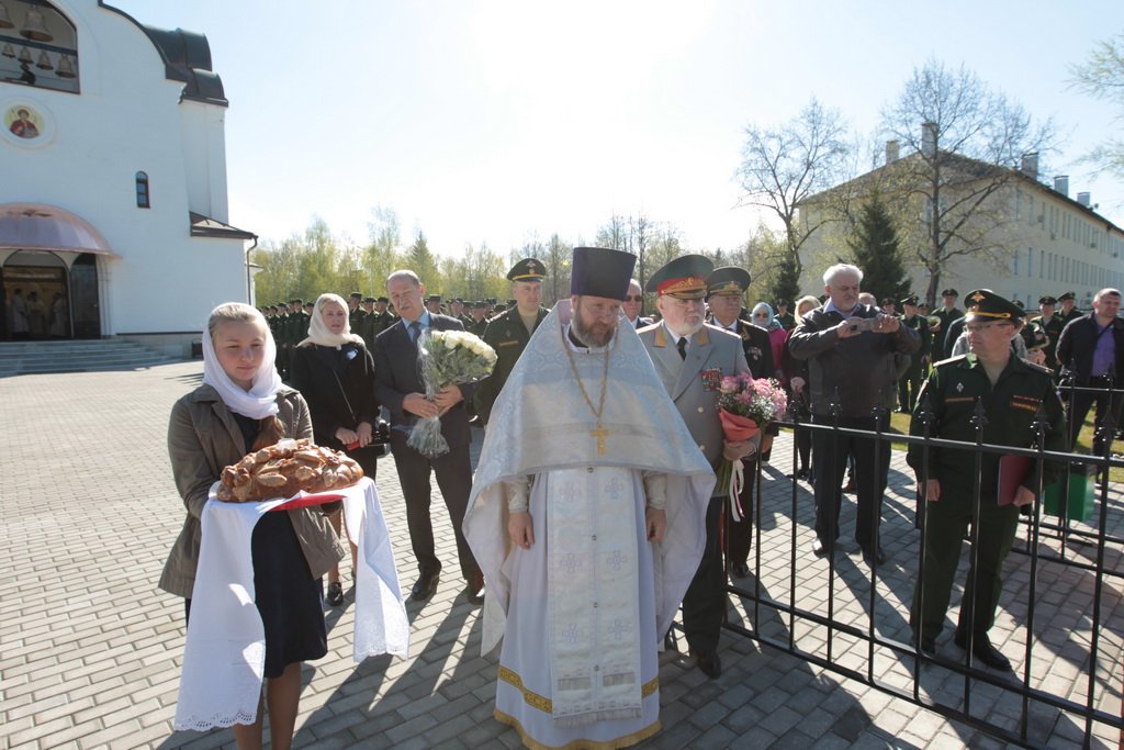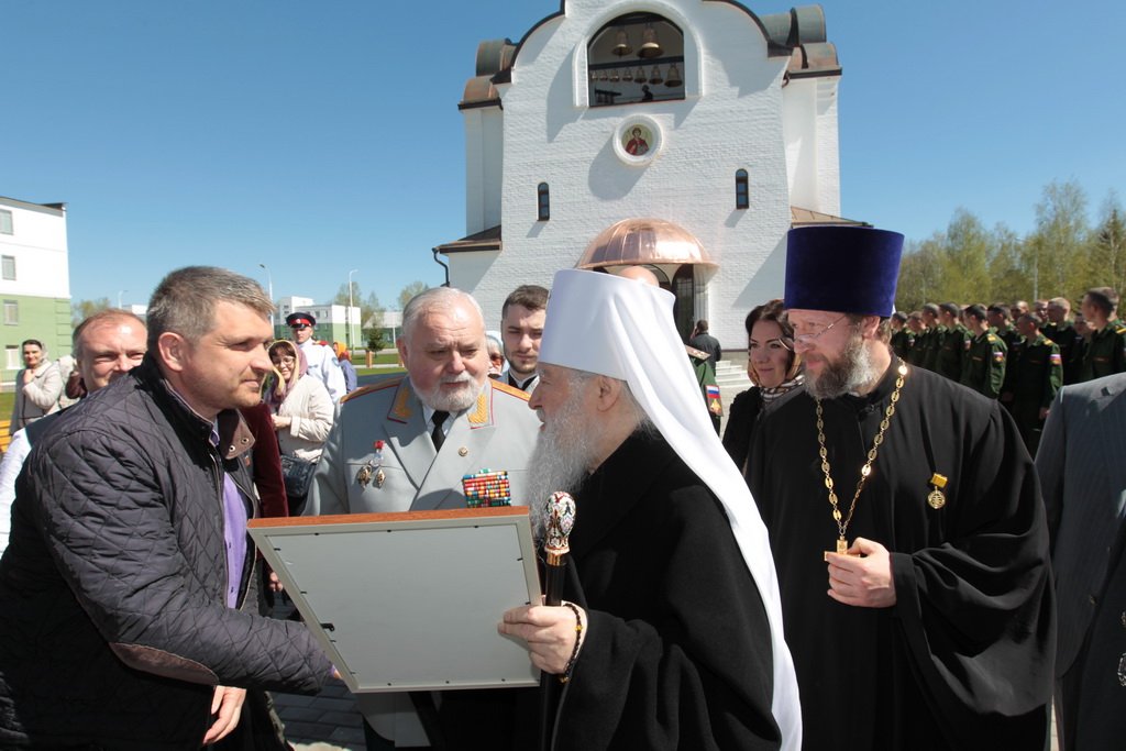 Затем Его Высокопреосвященство обратился к духовенству и молящимся с архипастырским словом: «Дорогой Александр Валентинович, наши военачальники, военнослужащие, братья и сестры, священнослужители! Я с душевным волнением посещаю это место и радуюсь, что принял участие в великом освящении храма великомученика Георгия Победоносца в день его престольного праздника. Мне говорили, что в последнее время члены семей военнослужащих посещали храмы в населенных пунктах поблизости, а теперь для них создан этот храм, и, как Вы замечательно сказали, Александр Валентинович, он построен и для тех, кто ищет Бога, стремится к Богу, кто в церкви хочет получить утешение. Мы встречаемся на пороге Дня Победы — это наш всенародный праздник. Мало уже осталось ветеранов Великой Отечественной войны, но мы считаем себя детьми этой войны, потому что в раннем детстве пережили ужасы и кошмары бомбежек, гибель людей. Рядом с нами разрывались бомбы, но мы остались живы, и в этом великая заслуга наших воинов. Ветераны Великой Отечественной войны — это живые памятники верности Родине, мужества, доблести и отваги, и мы молимся, чтобы Господь дал им человеческое счастье и Свое благословение. Я радуюсь, что в этом месте военнослужащие смогут предстать перед Богом, испрашивая Его помощи и благословения на свое служение. В Церкви много примеров мужества и верности: Георгий Победоносец пострадал в 303 году, и с тех пор до сегодняшнего дня он находится в памяти воинов и всех христиан, которые восхищаются его мужеством. Для Москвы и Московской области это тоже особенный праздник, потому что на их гербах изображен великомученик Георгий Победоносец. И, наконец, мы встречаемся в светлые дни Пасхи Господней. Мы празднуем Пасху сорок дней, потому что вспоминаем, что до своего божественного Вознесения Христос в течение сорока дней являлся святым апостолам, женам-мироносицам и множеству верующих, утверждая их в вере в то, что Он воистину воскрес. Этот праздник вдохновляет нас в этой временной жизни и уверяет нас, что мы наследуем вечную жизнь в Царствии небесном, и что как Христос воскрес, так Он воскресит и нас. Мне трогательно было узнать, что не только здесь, но, благодаря доброму отношению министра обороны Сергея Кужугетовича, и в других воинских частях созидаются храмы Божии, а священнослужители допускаются для духовного окормления нашего воинства. Я думаю, что это укрепляет воинский дух, чувство патриотизма и веру. Мы благодарим Бога, что великий День Победы наша страна встречает в мире и единомыслии, и молимся Ему, чтобы это благословенное время никогда не кончалось. Молитвами новомучеников и исповедников Церкви Русской пусть Господь сохранит Россию. Я счастлив, что мы в этом году особенно отмечаем память новомучеников и исповедников Церкви Русской, и изготовили пять ковчегов с их святыми мощами, начиная со Святейшего Патриарха Тихона. И вот первый такой ковчег доставлен вам, чтобы вы помолились новомученикам и получили их благословение».