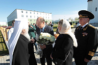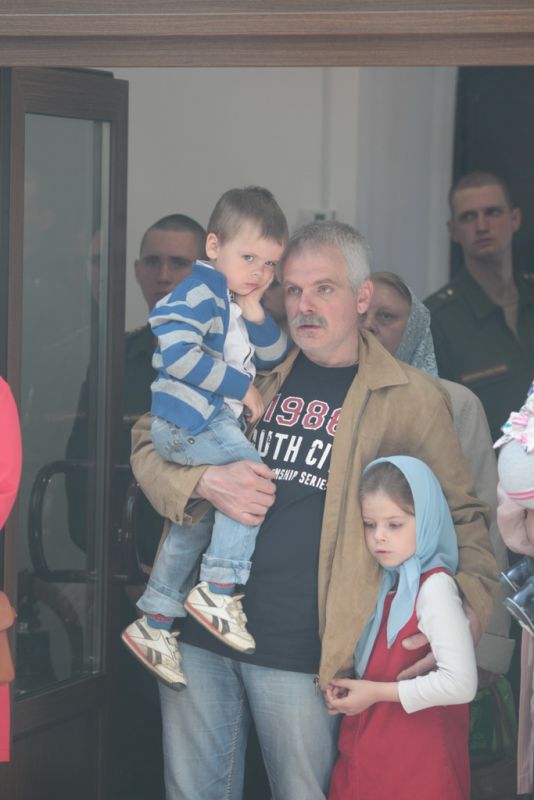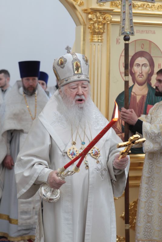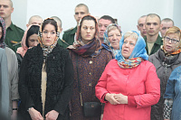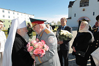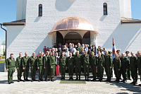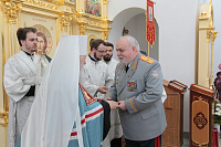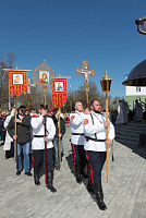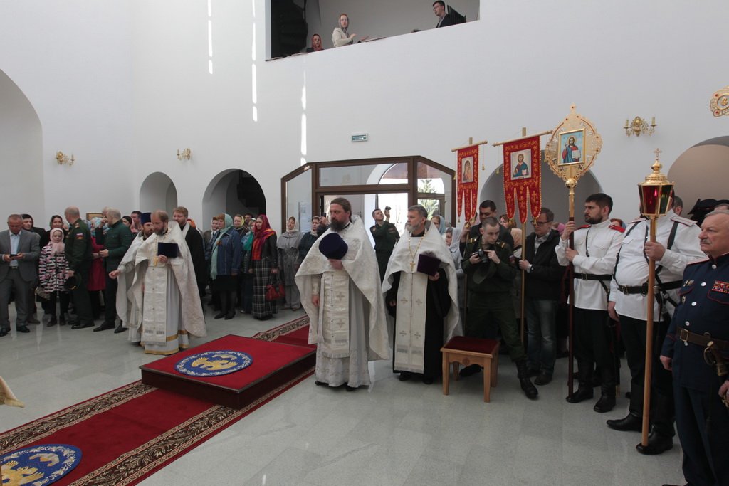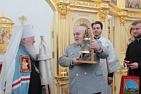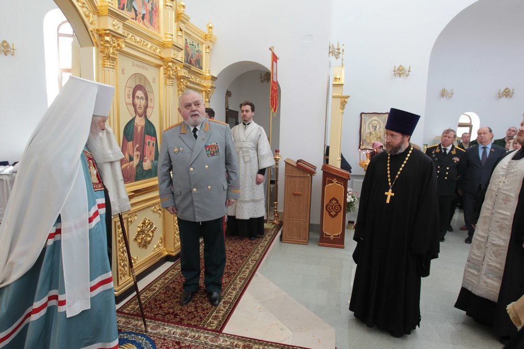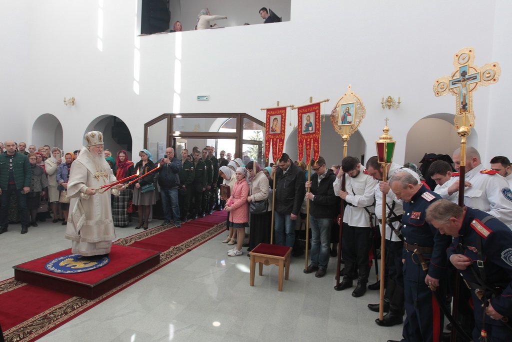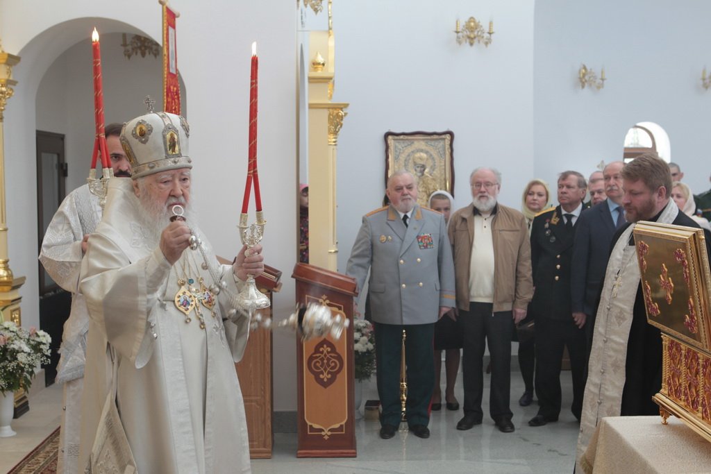 Затем Его Высокопреосвященство обратился к духовенству и молящимся с архипастырским словом: «Дорогой Александр Валентинович, наши военачальники, военнослужащие, братья и сестры, священнослужители! Я с душевным волнением посещаю это место и радуюсь, что принял участие в великом освящении храма великомученика Георгия Победоносца в день его престольного праздника. Мне говорили, что в последнее время члены семей военнослужащих посещали храмы в населенных пунктах поблизости, а теперь для них создан этот храм, и, как Вы замечательно сказали, Александр Валентинович, он построен и для тех, кто ищет Бога, стремится к Богу, кто в церкви хочет получить утешение. Мы встречаемся на пороге Дня Победы — это наш всенародный праздник. Мало уже осталось ветеранов Великой Отечественной войны, но мы считаем себя детьми этой войны, потому что в раннем детстве пережили ужасы и кошмары бомбежек, гибель людей. Рядом с нами разрывались бомбы, но мы остались живы, и в этом великая заслуга наших воинов. Ветераны Великой Отечественной войны — это живые памятники верности Родине, мужества, доблести и отваги, и мы молимся, чтобы Господь дал им человеческое счастье и Свое благословение. Я радуюсь, что в этом месте военнослужащие смогут предстать перед Богом, испрашивая Его помощи и благословения на свое служение. В Церкви много примеров мужества и верности: Георгий Победоносец пострадал в 303 году, и с тех пор до сегодняшнего дня он находится в памяти воинов и всех христиан, которые восхищаются его мужеством. Для Москвы и Московской области это тоже особенный праздник, потому что на их гербах изображен великомученик Георгий Победоносец. И, наконец, мы встречаемся в светлые дни Пасхи Господней. Мы празднуем Пасху сорок дней, потому что вспоминаем, что до своего божественного Вознесения Христос в течение сорока дней являлся святым апостолам, женам-мироносицам и множеству верующих, утверждая их в вере в то, что Он воистину воскрес. Этот праздник вдохновляет нас в этой временной жизни и уверяет нас, что мы наследуем вечную жизнь в Царствии небесном, и что как Христос воскрес, так Он воскресит и нас. Мне трогательно было узнать, что не только здесь, но, благодаря доброму отношению министра обороны Сергея Кужугетовича, и в других воинских частях созидаются храмы Божии, а священнослужители допускаются для духовного окормления нашего воинства. Я думаю, что это укрепляет воинский дух, чувство патриотизма и веру. Мы благодарим Бога, что великий День Победы наша страна встречает в мире и единомыслии, и молимся Ему, чтобы это благословенное время никогда не кончалось. Молитвами новомучеников и исповедников Церкви Русской пусть Господь сохранит Россию. Я счастлив, что мы в этом году особенно отмечаем память новомучеников и исповедников Церкви Русской, и изготовили пять ковчегов с их святыми мощами, начиная со Святейшего Патриарха Тихона. И вот первый такой ковчег доставлен вам, чтобы вы помолились новомученикам и получили их благословение».