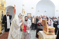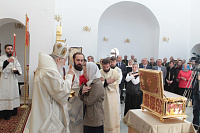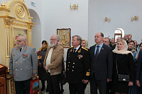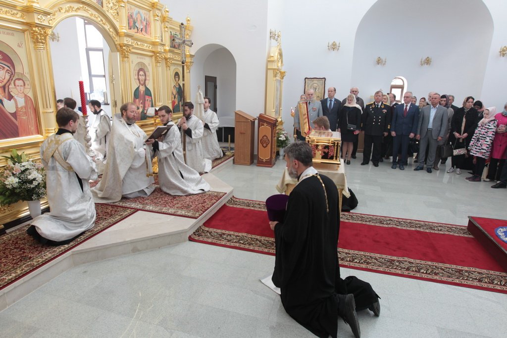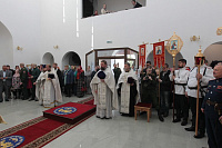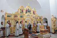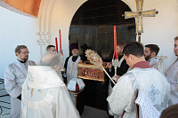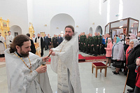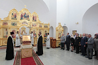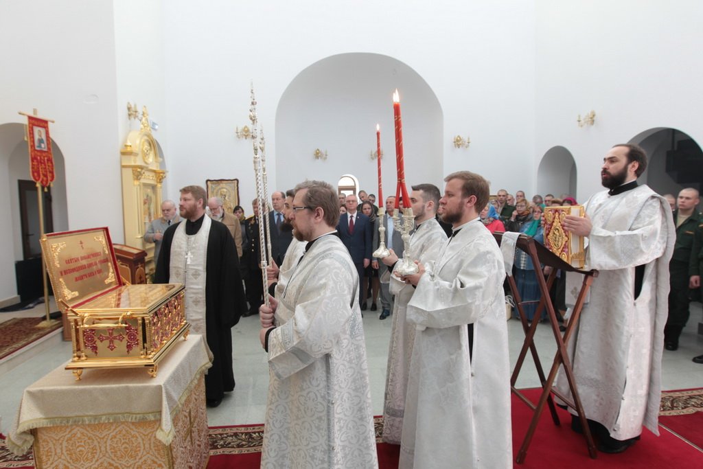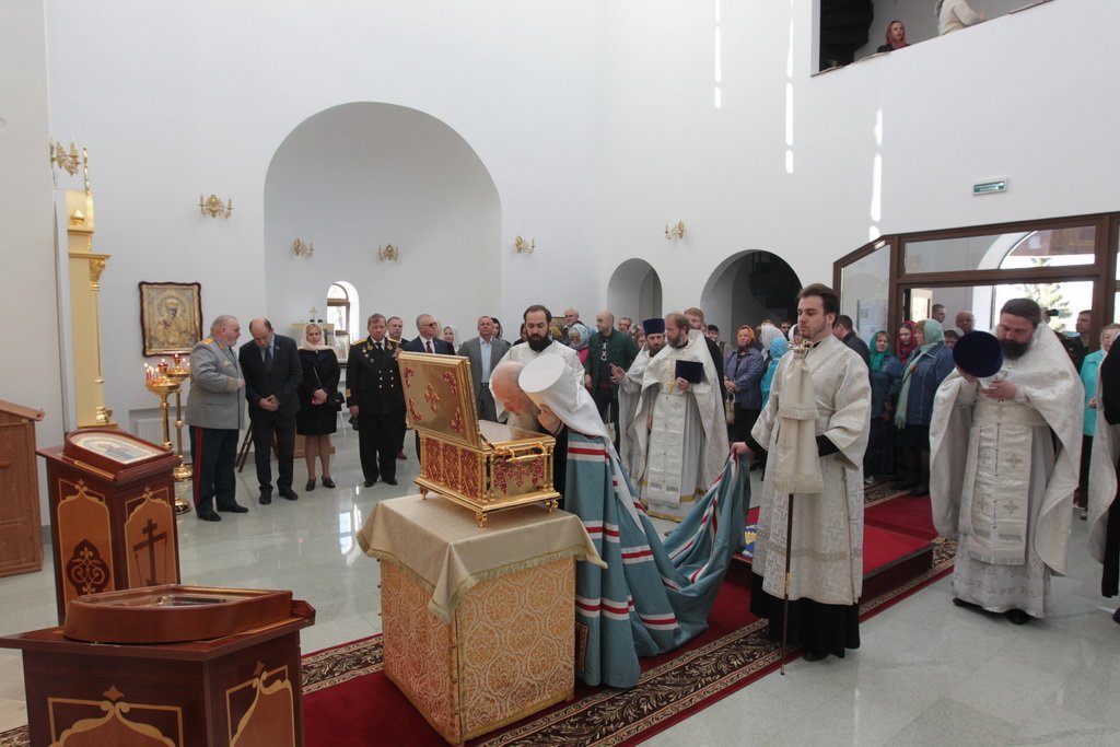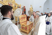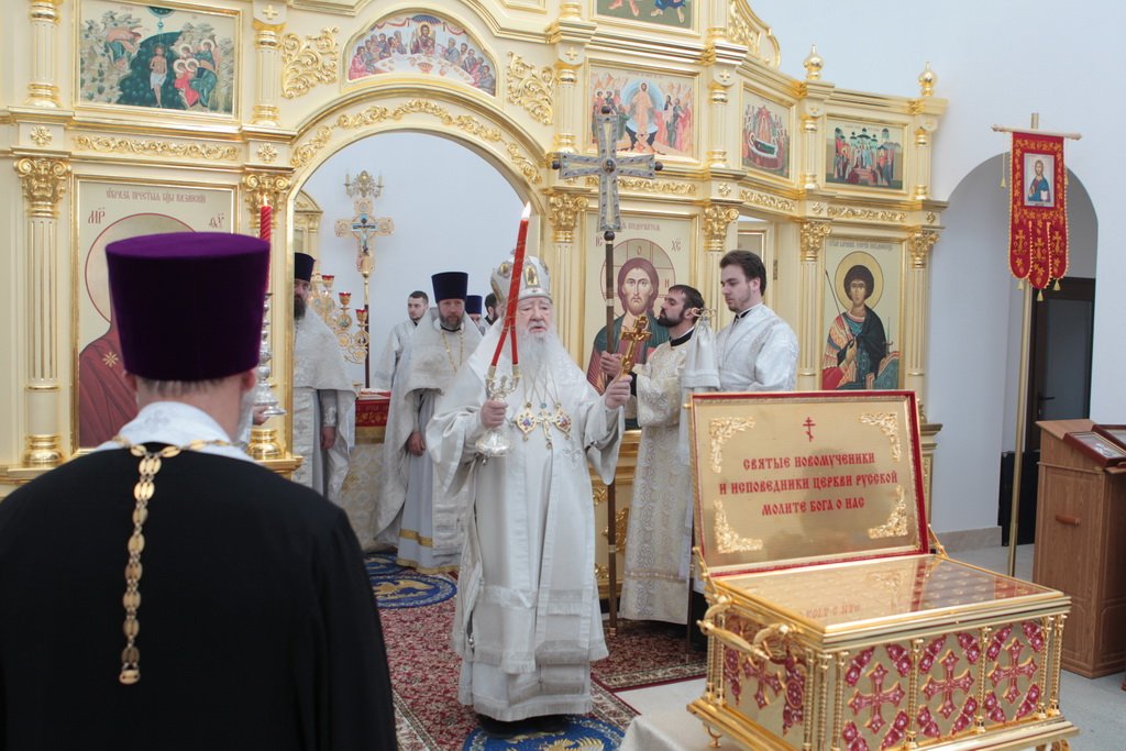 Накануне в Георгиевский храм был доставлен ковчег со святыми мощами новомучеников и исповедников Церкви Русской. Богослужение началось с поклонения этой святыне.