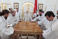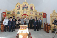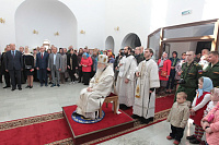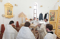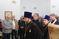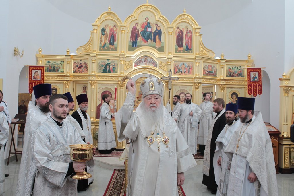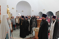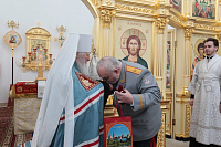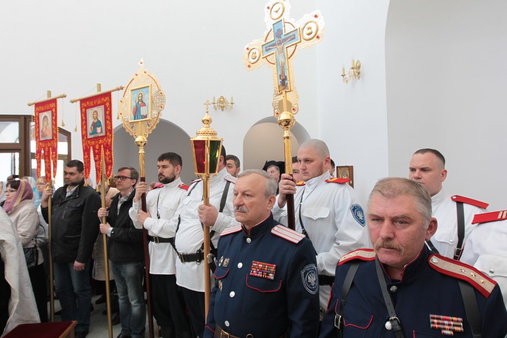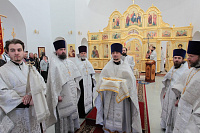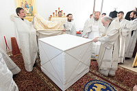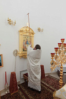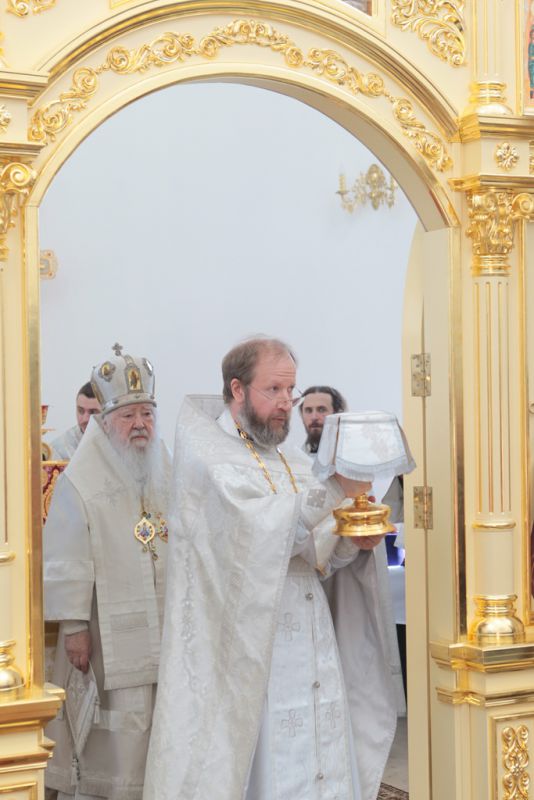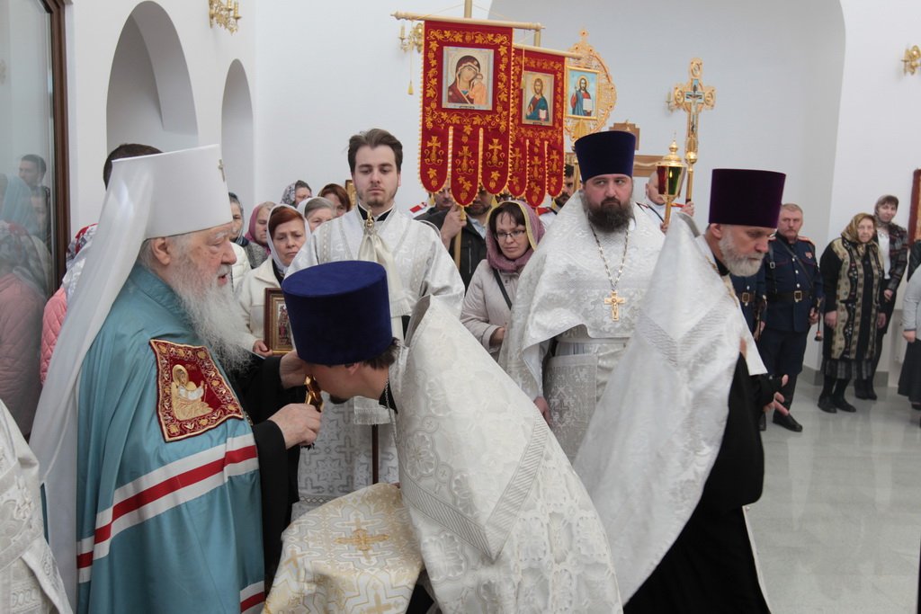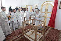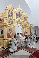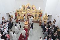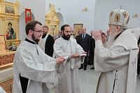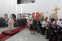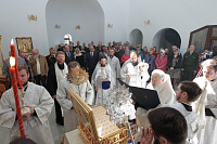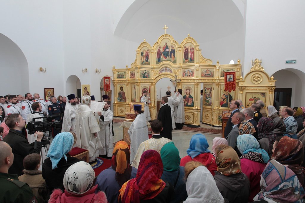 Накануне в Георгиевский храм был доставлен ковчег со святыми мощами новомучеников и исповедников Церкви Русской. Богослужение началось с поклонения этой святыне.