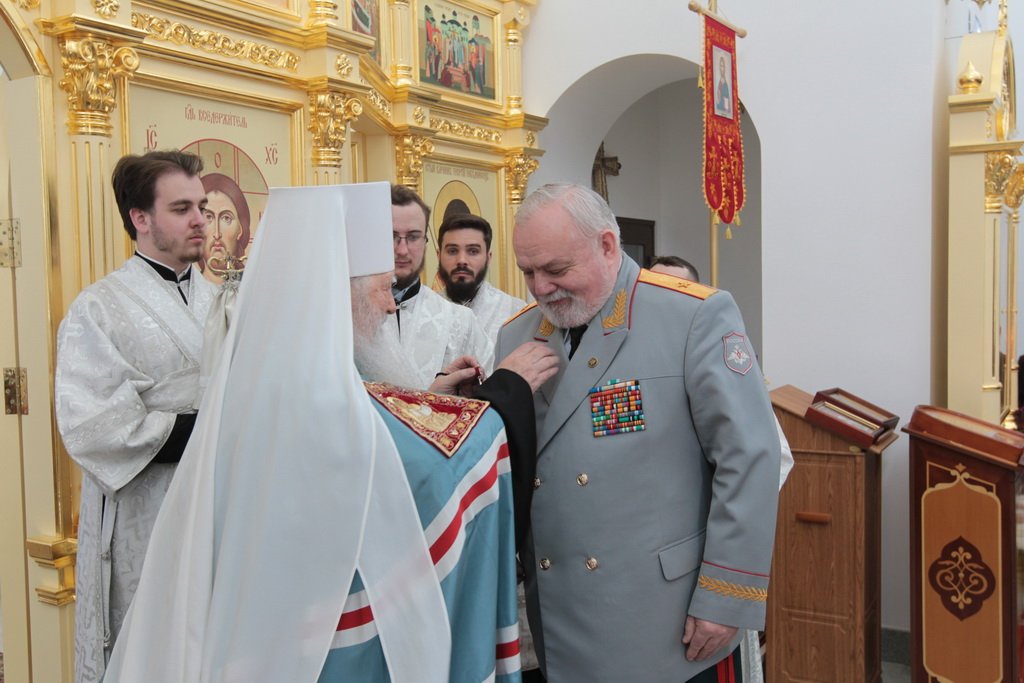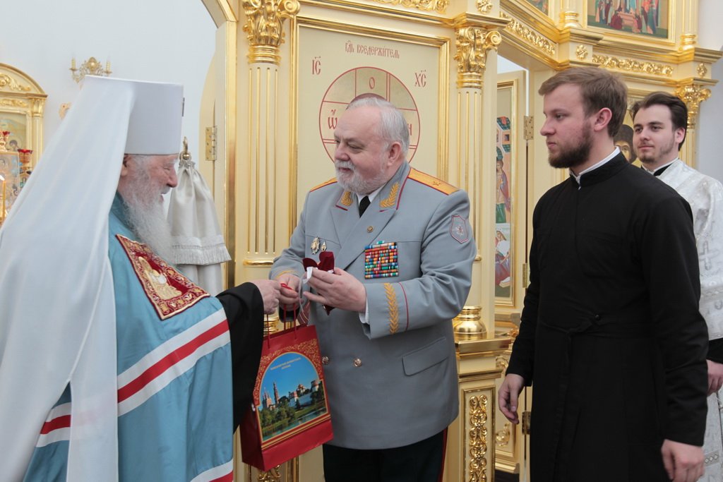 Владыке митрополиту сослужили председатель Епархиального отдела по взаимодействию с Вооруженными силами и правоохранительными учреждениями протоиерей Марк Ермолаев, благочинный Наро-Фоминского церковного округа протоиерей Олег Митров, клирики Наро-Фоминского благочиния. За богослужением пел хор Никольского собора г. Наро-Фоминска.