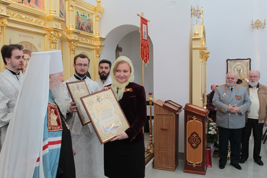 Владыка митрополит вручил благотворителям, благоукрасителям и труженикам храма награды Московской епархии. Заместитель министра обороны России, генерал армии Д. В. Булгаков был удостоен медали «За жертвенные труды» I степени, депутат Государственной Думы А. В. Скоч — медали «За жертвенные труды» II степени, референт заместителя министра обороны РФ, генерал-майор А. В. Кирилин — медали «За жертвенные труды» III степени. Глава административного поселения Марушкинское А. Б. Стиславский, исполнительный директор ООО «Интерстрой» А. А. Шмагин, начальник отдела военного образования и подготовки специалистов материально-технического обеспечения штаба МТО ВС РФ Е. М. Выскребенцев, советник инвестиционной компании «Урмар» А. В. Михновский, исполнительный директор инвестиционной компании «Урмар"Т. С. Михновская и председатель совета директоров группы компаний «МАКС» В. М. Калькаев были удостоены благословенных грамот митрополита Ювеналия.
