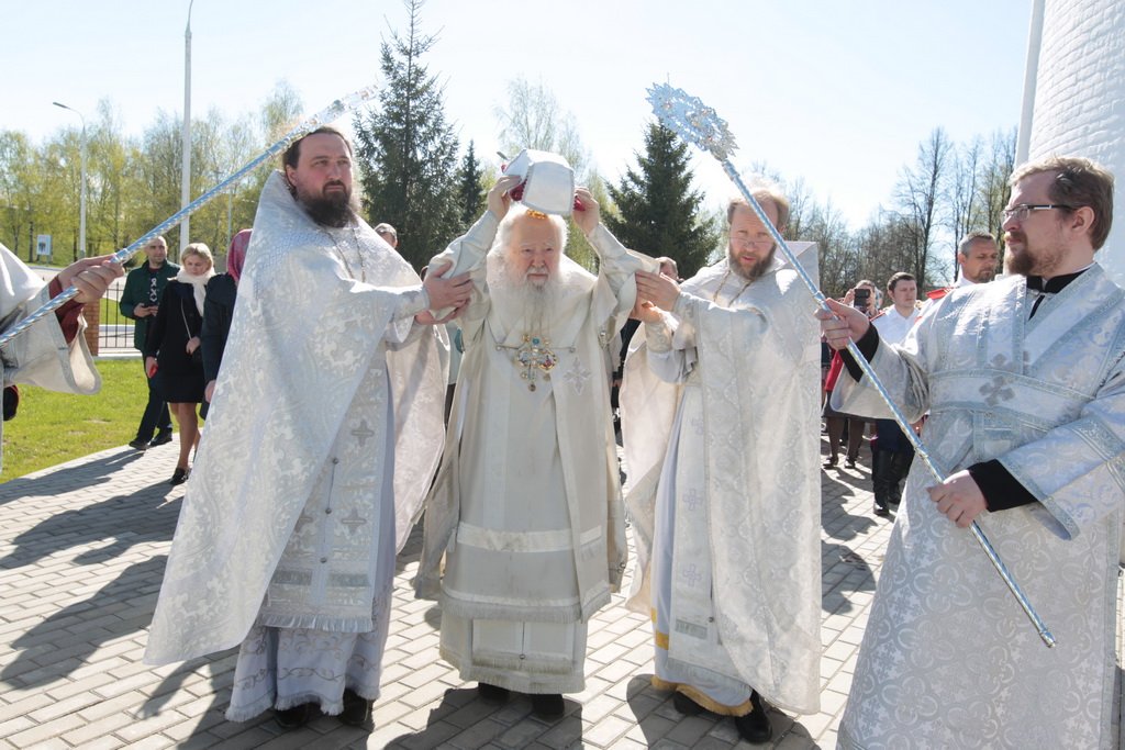 По окончании Божественной литургии было совершено славление перед ковчегом с мощами новомучеников и исповедников Церкви Русской. После возглашения многолетий Владыку митрополита приветствовал референт заместителя министра обороны Российской Федерации, генерал-майор А. В. Кирилин: «Ваше Высокопреосвященство! Позвольте мне от имени всех присутствующих и от лица заместителя министра Вооруженных сил Российской Федерации, нашего начальника, попечением которого был построен этот храм, принести Вам сердечную благодарность за то, что Вы взяли на себя труд совершить чин великого освящения нашего храма. Я думаю, что этот храм станет родным домом не только для воинов сотого полка и Таманской дивизии, но и для верующих и стремящихся к вере, живущих неподалеку от нас. Еще раз благодарим Вас, Владыка! Вы — старейший митрополит Русской Православной Церкви, человек, который в течение 45-ти лет несет крест митрополичьего и более 50-ти лет — архиерейского служения. Мы счастливы видеть Вас и участвовать в таком великом деле. Христос воскресе! Позвольте Вам преподнести в честь этого события памятный колокол. На нем написано, что это колокол в честь освящения храма великомученика Георгия в поселке Калининец, с дарственной надписью Вашему Высокопреосвященству. Надеюсь, что он будет напоминать Вам об этом дне».