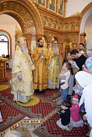 По окончании Литургии Владыка Ювеналий обратился к духовенству и молящимся с архипастырским словом: «Сердечно поздравляю вас, всечестные отцы, дорогие братья и сестры, с праздником. Причастников и причастниц поздравляю с принятием Святых Христовых Таин. Радуюсь, что созданный здесь Божий храм дает возможность жителям и отдыхающим в санатории находить дорогу к Богу. Сегодня здесь молилось много детей. Это очень утешает и вдохновляет меня, так как вселяет уверенность, что не напрасно были приняты старания по созданию на этом месте храма. Что такое храм Божий для верующих? Много можно об этом говорить, но в связи с прочитанным сегодня за Божественной литургией Евангелием, хочется сказать, что храм – это школа благочестия. И вот почему. Где можем мы научиться исполнению заповедей Божиих, которые изложены в Святом Евангелии? Об этом каждый день, когда совершается Божественная литургия, читается какой-нибудь отрывок из Святого Евангелия, который помогает нам понять, что ожидает от нас Господь, что мы должны исполнять и как в своей жизни. Сегодня за богослужением был прочитан удивительный отрывок из Святого Евангелия от Матфея, где говорится о том, что придя в город Капернаум, к Спасителю подошел сотник и обратился к Нему с просьбой: «Господи! слуга мой лежит дома в расслаблении и жестоко страдает» (Мф. 8:6). Иисус говорит ему: «Я приду и исцелю его» (Мф.8:7). Сотник же, отвечая, сказал: «Господи! я недостоин, чтобы Ты вошел под кров мой, но скажи только слово, и выздоровеет слуга мой» (Мф.8:8). Этот сотник проявляет глубокую веру. Во-первых, исповедуя свое недостоинство и смирение, он говорит: «Я не достоин, чтобы ты вошел ко мне, но скажи только слово и исцелеет он». Господь похвалил веру этого человека и сказал: «Иди, и, как ты веровал, да будет тебе» (Мф. 8:13). В тот же момент его слуга выздоровел. Какое же назидание мы получаем из этого? Редко, наверное, так бывает, что начальствующие в народе заботятся о своих подчиненных. Этот человек обладал большой властью, у него в подчинении были многие. Он сам говорит из своего опыта: «Говорю одному: пойди, и идет; и другому: приди, и приходит; и слуге моему: сделай то, и делает» (Мф. 8:9). А он ни о чем другом не просит Спасителя при встрече с Ним, как только исцелить своего болящего раба. Вот для начальствующих какой великий пример того, как нужно заботиться о своих подчиненных.