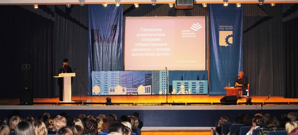 25 апреля в актовом зале администрации г.о. Электросталь прошло городское родительское собрание на тему «Нравственные ценности – основа воспитания детей». Среди участников собрания были начальник управления образования администрации городского округа Электросталь Елена Митькина, благочинный церквей Богородского округа протоиерей Марк Ермолаев, настоятель Вознесенского храма городского округа Электросталь протоиерей Сергий Поддубный. Протоиерей Марк Ермолаев рассказал об опыте общения священников со школьниками. Ученики электростальских школ прочитали отрывки из сочинений о Родине и о нравственных ценностях. В фойе была развернута выставка творческих работ педагогов, учащихся и воспитанников дошкольных образовательных учреждений на духовно-нравственную тему.