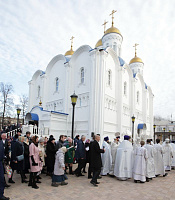 Возлюбленные архипастыри и пастыри, дорогой отец Сергий, уважаемый Олег Владимирович! Я ликую душой, находясь с вами по случаю такого радостного события. Я помню, как во время пасхальных дней 2004 года я освящал на этом месте закладной камень в основание храма. Незаметно пролетели годы, и Господь судил мне видеть благолепие воздвигнутого храма в честь иконы Божией Матери «Иерусалимская». Много трудов положено, много молитв здесь совершалось при воздвижении этого храма, и сегодня мы радуемся и торжествуем, что Господь дал нам силы и возможность воздвигнуть этот собор. Я иначе не могу назвать это сооружение – настолько оно величественно и прекрасно. Мне хочется выразить радость о нашей встрече в тот день, когда мы отмечаем память новомучеников вашего града. Их двадцать, причисленных к лику святых, но мы знаем, что и на Воскресенской земле, и на Подмосковной, и по всей России тысячи и тысячи архипастырей, пастырей, монашествующих и мирян пострадали в период гонения на веру. И это их молитвами Господь помогает в жизни и наших трудах. Они любили Церковь и учат нас, как веровать в Бога, как творить дела милосердия, они являются нашими небесными покровителями, потому что если они при жизни стояли у престола Божия и освящали молитвами свой народ, то и сейчас перед престолом Божиим на небесах они постоянно молятся за каждого из нас. Их молитвами воздвигнут этот храм. И вознося благодарение всем строителям, благотворителям, жертвователям это храма, мы в первую очередь благодарим Матерь Божию – Покровительницу нашей земли, и святых угодников Божиих, которые помогли нам устоять в вере и воздвигнуть этот храм. Я горячо и сердечно поздравляю вас с этим значимым для нас событием. Я рад, что вы во множестве собрались на Божественную литургию и знаю, что много еще есть храмов в Воскресенске, где молятся наши верующие, и мне хочется духовно обнять их всех, поблагодарить за их верность Церкви Христовой, за их твердую веру, и пожелать, чтобы они не только в своем сердце несли эту веру, но и воспитывали в Православии своих детей и родственников. Я поздравляю вас с праздником, причастников и причастниц — с принятием Святых Христовых Таин.