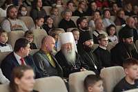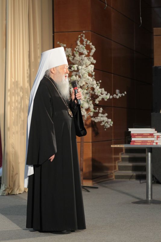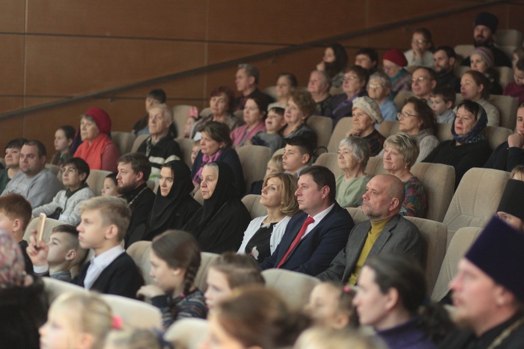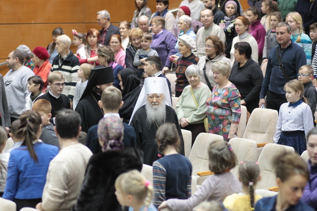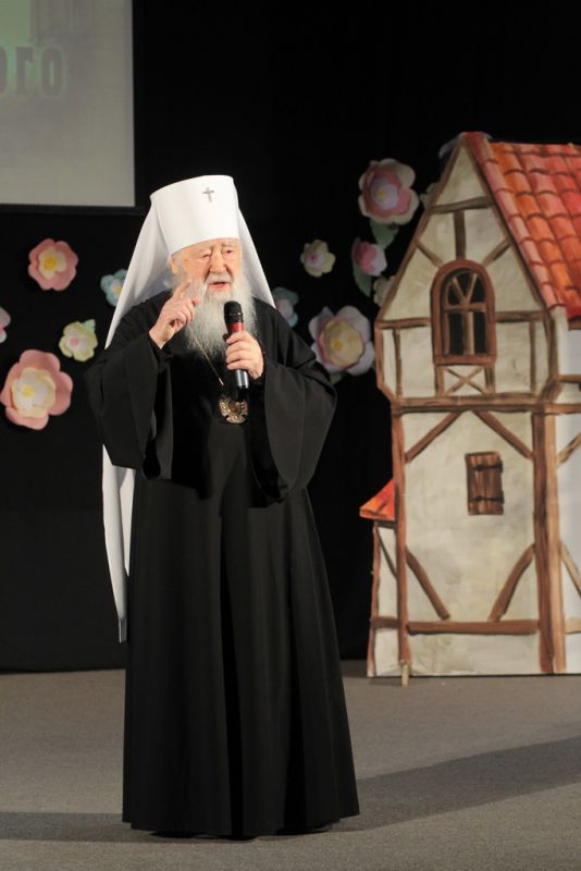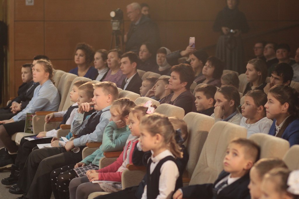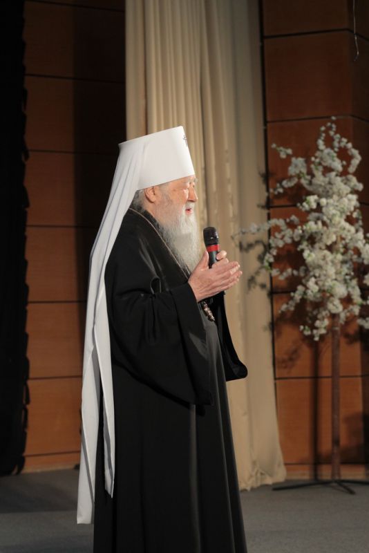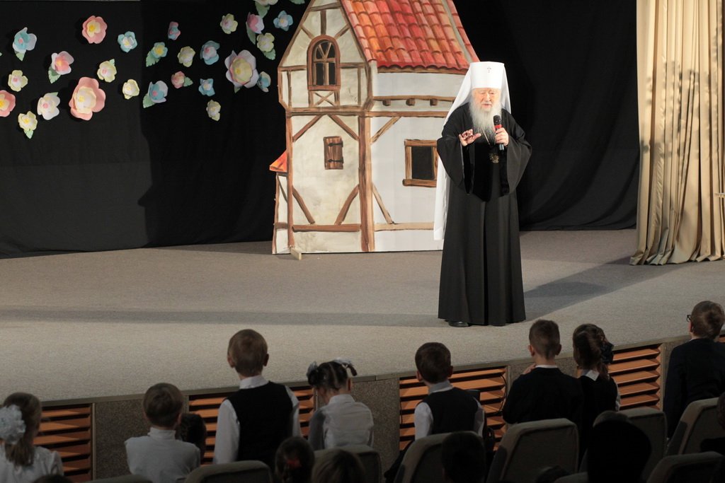 Я очень рад всех вас горячо и сердечно приветствовать. Думаю, что вы не можете понять всей глубины радости, которую я сегодня испытываю, находясь здесь, в этом ледовом дворце, видя вас, дорогие дети. Я сейчас вспоминаю далекие-далекие годы. В 1977 году, когда я стал митрополитом Крутицким и Коломенским, то, конечно, ехал в Коломну с трепетным чувством, вспоминая святителя Филарета, который родился в Коломне и получил здесь первые наставления в вере. В своих воспоминаниях святитель говорил о Коломне как о «Небесном Иерусалиме», то есть он этот город сравнивал с тем городом, в котором Христос пострадал и воскрес из мертвых. И я с трепетом ждал, что увижу здесь этот Небесный Иерусалим, но каково же было мое разочарование! Я увидел здесь духовную пустыню: храмы закрыты, некоторые разрушены, другие осквернены, и лишь на окраине города был действующим один Богоявленский храм, в котором крестили святителя Филарета. Этот храм стал моим первым кафедральным храмом. И я молился святителю Филарету, чтобы по любви к этому городу, этому народу, этой святыне он вернул Коломне ее былую славу. Нелегко было, очень нелегко, но прошли сорок лет — и вы живете в Небесном Иерусалиме. Знаете ли вы, что здесь четыре монастыря, множество храмов, которые отреставрированы, некоторые еще строятся, и что здесь удивительная духовная атмосфера! Я помню, как однажды я приехал в Коломну, и тогдашний губернатор Борис Всеволодович Громов сказал мне, что в тот день должен был приехать сюда Президент, Владимир Владимирович Путин для того, чтобы посмотреть на строительство ледового дворца. Прежде, чем ехать на стройку, Владимир Владимирович зашел в наш кафедральный собор, помолился, поставил свечу, и мы его там приветствовали, а потом мы с губернатором прошлись по нашему Ново-Голутвину монастырю и я рассказывал, как мы тут живем, как реставрируем храмы, и, посмотрев на одно из зданий, он спросил: «А это что?» «Это моя резиденция», — ответил я. Он спрашивает: «А почему она без крыши, без окон, без дверей?» Я говорю: «Все только недавно передано. Сейчас мы заканчиваем реставрацию кафедрального собора, и когда закончим дом Божий, тогда будем и свой реставрировать». И Борис Всеволодович сказал: «Я вам отреставрирую». Тот, кто был здесь, видел, в каком сейчас состоянии Ново-Голутвин монастырь и резиденция —все было восстановлено уже в те годы. Я всё это говорю для того, чтобы напомнить вам о жизни святителя Филарета. Он ведь крестился в Богоявленском храме, и знаменательно, что именно этот единственный храм никогда не закрывался, и в нем всегда совершались богослужения. И сегодня мы не только молимся в храмах, мы имеем возможность обратить Слово Божие к детям. Все, что мы видим сегодня, дорогие дети, этого сорок лет назад не было. Мы радуемся, что живем в свободной стране, где Церковь имеет возможность осуществлять свое служение не только в храме Божием, но и вне его пределов. Вспоминая святителя Филарета, хочу вам напомнить, что он происходил из священнической семьи и с детства был воспитан в вере. И эти воспоминания он хранил до своей кончины в возрасте 85-ти лет — вот что значит семя веры, которое посеяно в сердце человека в детстве. Я очень рад, что ваши родители придают большое значение вашему духовному воспитанию. Мне хочется особенно приветствовать первоклассников. Я приглашаю вас сюд