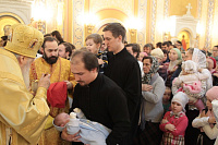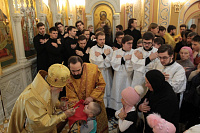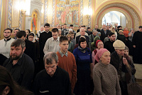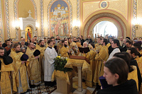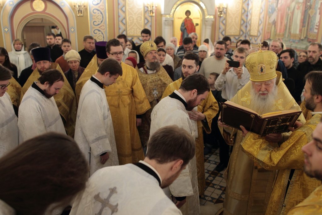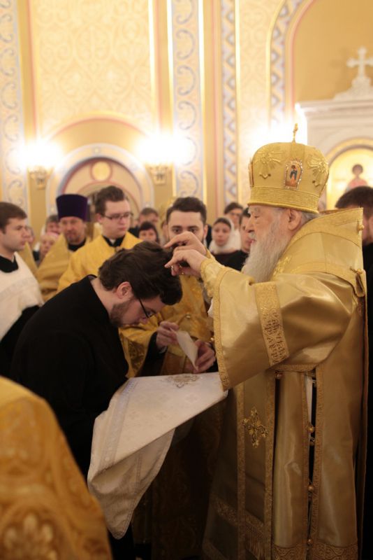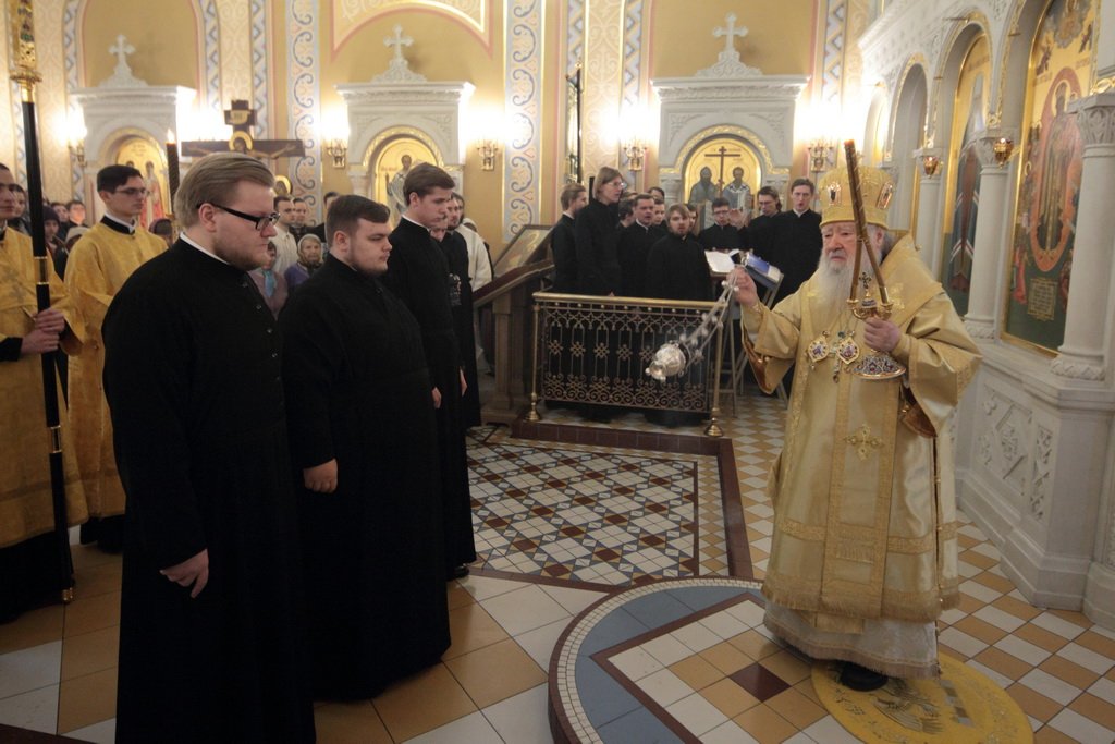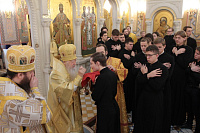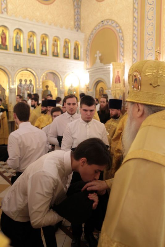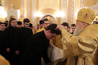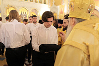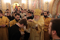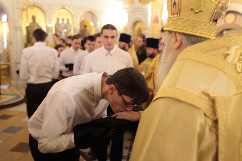 Перед Божественной литургией митрополит Ювеналий совершил постриг двенадцати студентов 4 курса семинарии во чтецы и преподал благословение на ношение подрясников шестнадцати студентам-первокурсникам.