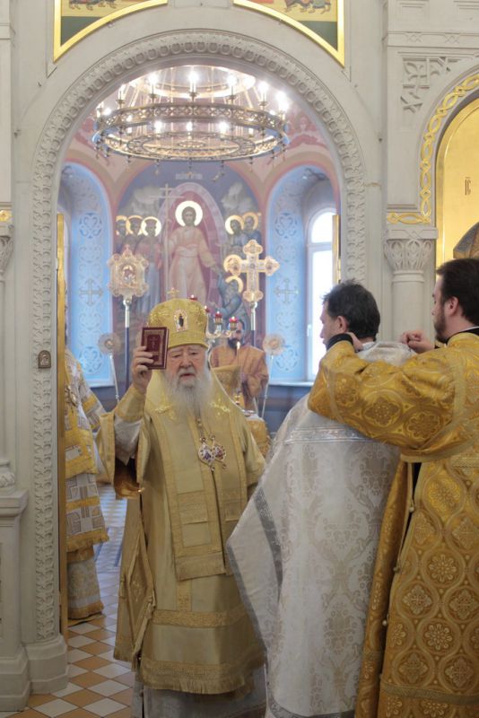 Ваше Преосвященство, дорогой Владыка Константин, Ваше Преосвященство, дорогой Владыка Петр, всечестные отцы, дорогие братья и сестры! Я счастлив, что Господь дал мне сегодня радость быть с вами и совершить Божественную литургию в день памяти великого угодника Божия, святителя Филарета. Я не буду повторяться, потому что сегодня в проповеди говорилось о святителе Филарете, много сказал о нем и Владыка ректор, но мне хочется от души поздравить вас с этим великим днем Москвы, Коломны и всей России. Совершая Божественную литургию, мы всегда обращаем свои мысли к евангельским словам, которые на ней звучат. Сегодняшнее евангельское повествование напоминает нам, что все мы мятемся в этом мире, заботимся о земном благополучии, а Христос всем нам в назидание говорит: «Безумный! в сию ночь душу твою возьмут у тебя» (Лк. 12:20), то есть: «сегодня умрешь, и кому это все останется?» Это Он сказал о богаче, который думал, что собрал много всего, и у него этого богатства хватит на много лет вперед. Вот эти слова Христа-Спасителя напоминают нам о том, что, конечно, нам необходимо питать и греть свою плоть (см.: Еф. 5:29), жить, но цель-то жизни какая, дорогие братья и сестры? Чтобы ее прожить так, чтоб быть достойными Царствия Небесного — вот этому служит Святая Христова Церковь. Она, как маячок, ведет людей ко спасению, к Царствию Божию, и в нем, как звезды небесные, которые указывают путь, светят наши подвижники. И таким был святитель Филарет. Все 85 лет, которые он прожил, были духовным горением, служением Богу и людям. Он был прост в быту, но в учении мудр и в назидании строг. 24 года тому назад Архиерейским Собором Русской Православной Церкви он был причислен к лику святых. Это означает, что его поучения мы должны воспринимать как заповеди, как указания, ведущие в Царствие Божие. Я очень рад, что мы в Коломне чтим память святителя Филарета. Сегодня, можно сказать, день нашего города, и я рад, что не только мы, прихожане, но и дети ваши стараются узнать, кто такой был этот человек. И сегодня мы в ледовом дворце, по усердию Владыки Петра, встретимся с детьми и юношами, чтобы им сказать, что главное в нашей жизни, чем памятен нам святитель Филарет, который был родом из Коломны, и отсюда он взошел на небосвод святых угодников Божиих. Мне трогательно сегодня быть в семинарии, когда мы поставляли во чтецы, иподиаконы, диаконы, священники наших питомцев. Это показывает, что духовная семинария, которую возглавляет дорогой Владыка Константин, приносит свои плоды. Московская епархия большая, и на нас лежит великая ответственность перед Богом и людьми готовить смену, готовить пастырей Церкви, которые подражали бы нашим подвижникам, святым угодникам Божиим, и несли людям слово о спасении. Я радуюсь, что не только по моему впечатлению, но и по заключению Учебного комитета, представители которого недавно изучали жизнь семинарии, здесь, слава Богу, все благополучно. И я пользуюсь этой счастливой возможностью, чтобы поблагодарить тебя, возлюбленный Владыка Константин, профессорско-преподавательский состав, воспитателей, и поздравить студентов, потому что они должны понимать, что не зря они проводят юные годы в этих стенах. Их ждет великое пастырское служение, им есть, с кого брать пример. И что-то есть символическое в том, что здесь, в семинарии, почивает частица святых мощей святителя Фи