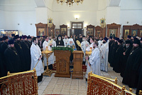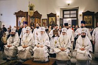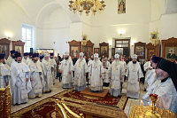 На Божественной литургии в Феодоровском храме обители Его Высокопреосвященству сослужили епископы Видновский Тихон, Серпуховской Роман, Зарайский Константин и Луховицкий Петр, секретарь Московского епархиального управления протоиерей Михаил Егоров, благочинные церковных округов и духовенство Московской епархии.