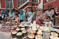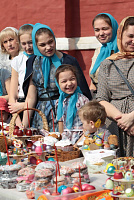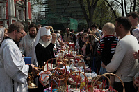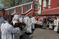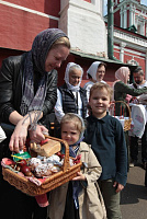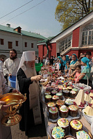 Затем около Успенского храма обители Владыка освятил куличи. Перед этим он обратился к собравшимся со словами архипастырского приветствия: «Дорогие возлюбленные братья и сестры! Мы вступаем в период великого и спасительного праздника – Пасхи Христовой. Когда мы будем праздновать Воскресение из мертвых Господа и Спасителя нашего Иисуса Христа, в наших храмах будут совершаться пасхальные богослужения. Я желаю, чтобы в ваши семьи тоже пришла пасхальная радость, и при освящении сегодня куличей, пасох и мясных продуктов вы также испытывали приближение праздника. Всем вам желаю счастья, здоровья и призываю на всех Божие благословение!»