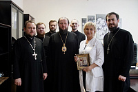 Главный врач Т.Н. Мельник познакомила архиепископа Аксия с работой больницы. Владыка пообщался с детьми и их родителями, пожелал всем скорейшего выздоровления, а медработникам – Божией помощи в их нелёгком труде врачевания.