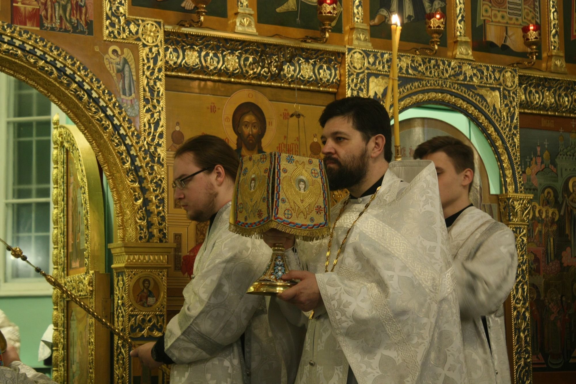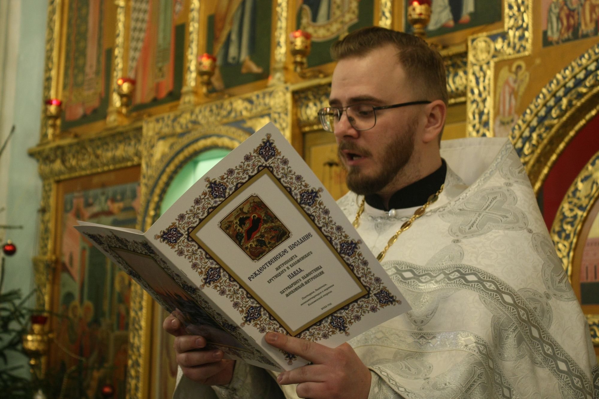 По запричастном стихе клирик собора иерей Василий Нелидкин зачитал Рождественское послание митрополита Крутицкого и Коломенского Павла, Патриаршего Наместника Московской митрополии.