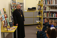 В библиотеке №3 г. Белоозерский прошла встреча учащихся МОУ Лицей №23 с настоятелем храма Всех святых в земле Российской просиявших протоиереем Романом Сыркиным. В ходе беседы отец Роман рассказал ребятам историю возникновения отечественного книгопечатания, а также о том что вкладывается в понятие «православная книга».