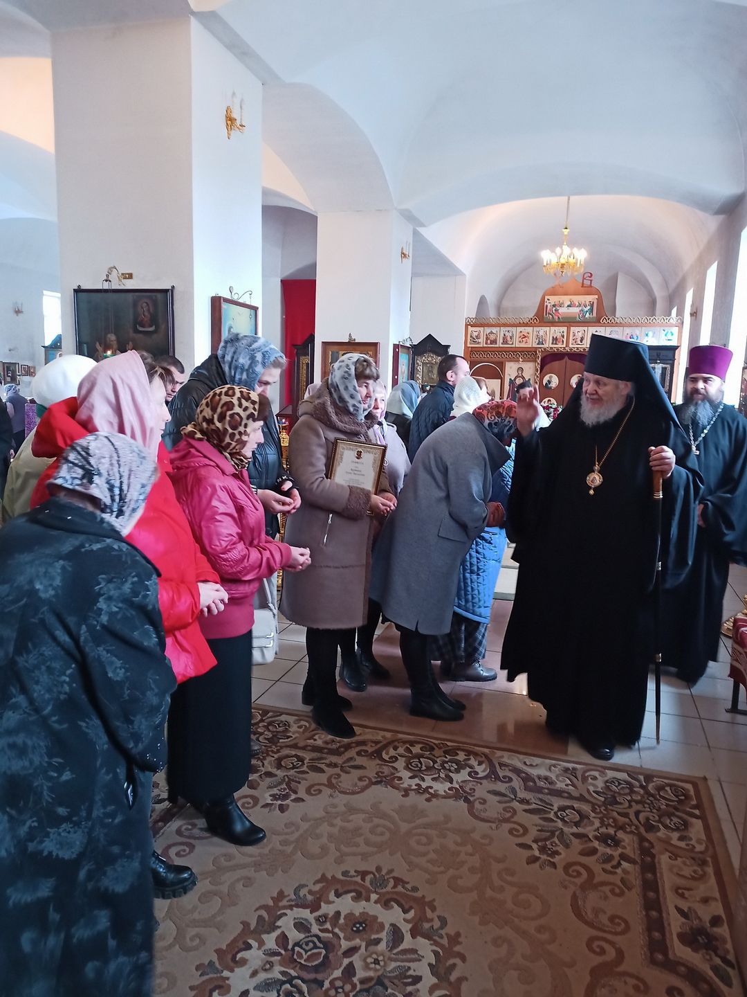 Затем Его Преосвященство обратился к сослужившему духовенству и молящимся с архипастырским словом и вручил начальнику территориального отдела г. Дрезна администрации Орехово-Зуевского городского округа Е.В. Крутовой благодарственную грамоту.
