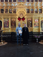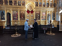 2 июня, в праздник Вознесения Господня, благочинный 1-го Бронницкого округа иерей Сергий Себелев вручил благодарность митрополита Крутицкого и Коломенского Павла руководителю ОАО «494 УНР» Алексею Ивановичу Киму. Отец Сергий также от лица прихода Михаило-Архангельского собора поблагодарил Алексея Ивановича за помощь в восстановлении кровли храма Иерусалимской иконы Божией Матери. После этого благочинный и А.И. Ким ознакомились с ходом реставрации храма Иерусалимской иконы Божией Матери и наметили перспективный план ремонтных работ в соборе Архангела Михаила в этом году.