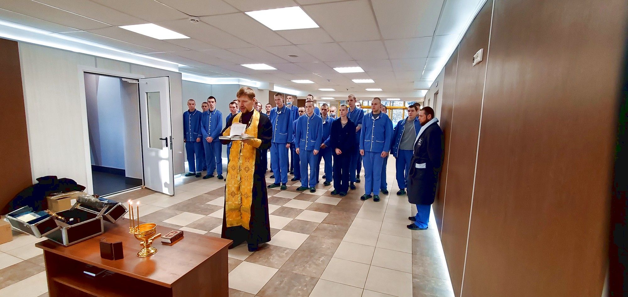 В этот же день отец Алексий посетил военный госпиталь в Хлебниково. Он совершил молебен о здравии болящих воинов, поздравил пациентов с праздником и передал подарки, подготовленные прихожанами храма преподобного Серафима Вырицкого г. Долгопрудный.